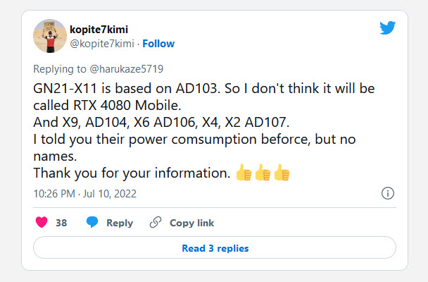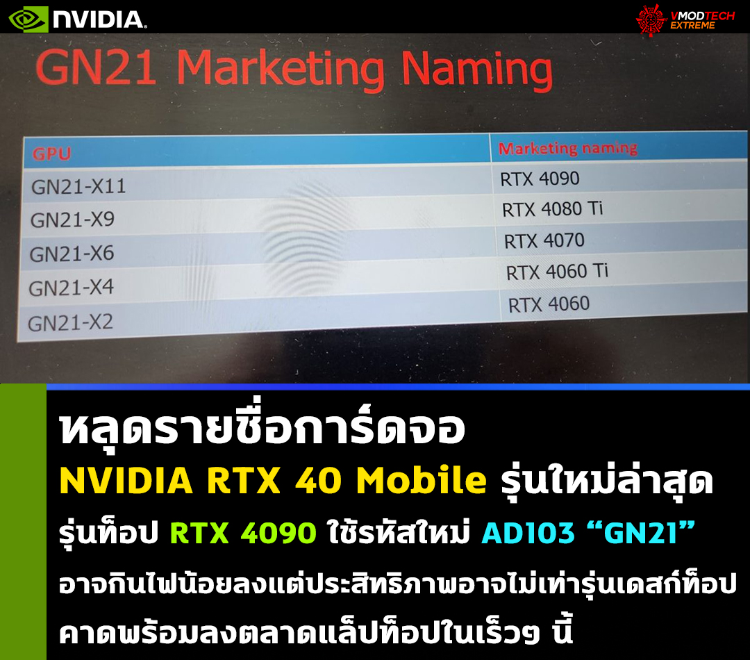 วันนี้ก็มีข่าวจากฝั่ง Nvidia หลุดออกมาให้เราได้ชมกันครับกับข่าวของการ์ดจอ NVIDIA RTX 40 Mobile รุ่นใหม่ล่าสุดพร้อมรุ่นท็อป RTX 4090 คาดพร้อมลงตลาดแล็ปท็อปในเร็วๆ นี้ หลุดออกมาให้ได้ชมกันครับ โดยจะใช้รหัส AD103 แทนที่จะเป็น AD102 (รุ่นเดียวกันกับเดสก์ท็อป) ซึ่งเป็นที่น่าสนใจมากๆ ที่ใช้รหัสแตกต่างกัน โดยในซีรีส์ NVIDIA RTX 40 Mobile ที่มีชื่อรหัสว่า “GN21” และคาดกันว่า Nvidia อาจจะเปลี่ยนแปลงประสิทธิภาพของแต่ละรุ่นให้ไม่เหมือนกับรุ่นเดิมที่รหัสการ์ดจอจะแรงใกล้เคียงับรุ่นเดสก์ท็อปเหมือนที่ผ่านมา โดย Nvidia อาจจะลดอัตราการบริโภคไฟหรือ TGP ลงในแต่ละรุ่นอีกด้วยครับ ซึ่งตามสไลด์ ‘GN21 Marketing Name’ ที่โพสต์โดย NVIDIA จะเปิดตัวการ์ดจอ RTX 40 mobile SKU มากถึง 5รุ่นกันเลยทีเดียว ก็รอดูกันครับว่าประสิทธิภาพจะแรงใกล้เคียงรุ่นเดสก์ท็อปกันหรือไม่ น่าสนใจจริงๆ