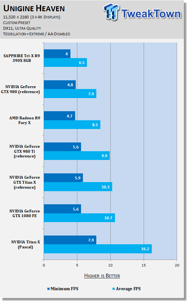 ยิ่งเทสต์โหดความแรงก็ยิ่งทิ้งห่าง!! ทางเว็บไซต์ TweakTown.com ได้นำผลทดสอบเปรียบเทียบโดยโปรแกรม Unigine Heaven Benchmark ที่ความละเอียดสูงถึง 11,520 X 2,160 หรือจอความละเอียด 4K ต่อกันสามตัว ปรากฏว่า NVIDIA TITAN X แรงกว่า NVIDIA GeForce GTX 1080 สูงสุดถึง 51.4% เลยทีเดียว แต่ถึงจะแรงกว่ามากยังไงก็ยังกระตุกสุดๆอยู่ดีครับ เอามาเล่นเกมส์จริงคงไม่ไหวแน่ๆกับความละเอียดระดับนี้