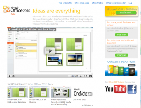เว็บไซต์ www.office2010thai.com และ Facebook ไมโครซอฟท์ ออฟฟิศ 2010 ประเทศไทย www.facebook.com/office2010thai นับเป็นช่องทางสื่อสารออ นไลน์ที่ผู้บริโภคจะสามารถสัมผัสประสบการณ์การใช้งานไมโครซอฟท์ ออฟฟิศ 2010 ได้อย่างเต็มรูปแบบ โดยเฉพาะการทำงานภายใต้คอนเซ็ปต์ 3 จอ ที่เชื่อมต่อระหว่างการใช้งานผ่านจอคอมพิวเตอร์ อินเทอร์เน็ต และโทรศัพท์มือถือ ในทุกที่ทุกเวลา เพื่อให้ผู้ใช้สามารถทำงานได้รวดเร็ว สะดวก และมีประสิทธิภาพมากยิ่งขึ้น โดยในเว็บไซต์และ Facebook จะมีการอัพเดทข่าวสาร ความเคลื่อนไหว กิจกรรมต่างๆ ฟีเจอร์เด่นๆ พร้อมวิดีโอเดโมที่แนะนำการใช้งานอย่าง ง่าย และฟรีดาวน์โหลด Microsoft Office 2010 เวอร์ชั่นเบต้า