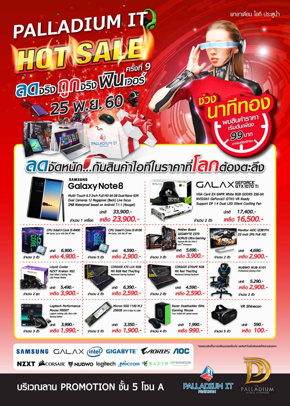 พบกับสินค้าไอทีราคาพิเศษสุด ๆ เริ่มต้นที่ 99 บาท มาก่อนมีสิทธิ์ก่อน พิเศษ! สำหรับ ผู้ที่ลงทะเบียนซื้อสินค้าทุกท่าน รับฟรี Gift Voucher มูลค่า 100 บาท และ ผู้ที่ลงทะเบียนผ่านเฟสบุค รับเพิ่มทันที Gift Voucher มูลค่า 100 บาท สำหรับซื้อสินค้าที่ PALLADIUM IT PRATUNAM ชั้น 4, 5 พบกัน วันเสาร์ที่ 25 พฤศจิกายน 2560 ณ ลาน PROMOTION ชั้น 5 ZONE A PALLADIUM IT PRATUNAM