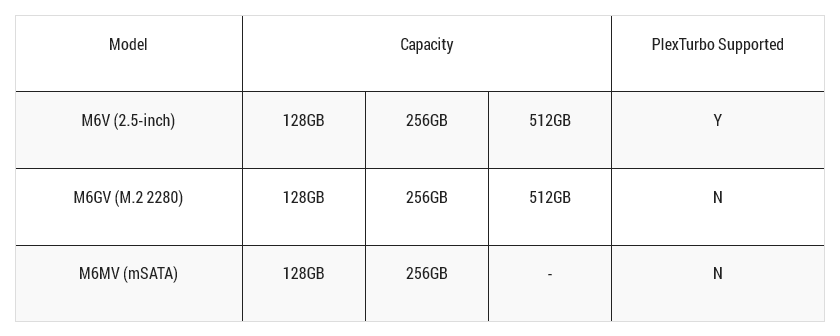 - Plextor M6V series จะเปิดการทำตลาดในย่านเอเชียตะวันออกเฉียงใต้ในช่วงเดือนสิงหาคม 2015 และจะมีวางจำหน่าย 3 สเป็ค และความจุ แสดงในตารางด้านล่าง
