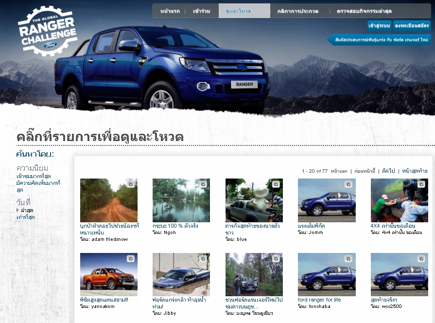 กรุงเทพฯ 18 สิงหาคม 2554 - เมื่อเร็วๆ นี้ ฟอร์ด ประเทศไทย ประกาศเปิดตัวอย่างเป็นทางการสำหรับแคมเปญการตลาดระดับโลก “เดอะ โกลบอล ฟอร์ด เรนเจอร์ ชาเล้นจ์ ภารกิจสุดท้าทายกับฟอร์ด เรนเจอร์ ใหม่”" (The Global Ford Ranger Challenge) ผู้สนใจเข้าร่วมกิจกรรม สามารถส่งใบสมัครระบุความ “ท้าทาย” และความ “ทรหด” ที่ต้องการทดสอบความแข็งแกร่ง และสมรรถนะของ ฟอร์ด เรนเจอร์ ใหม่ มาที่เว็บไซต์ของ “เดอะ โกลบอล ฟอร์ด เรนเจอร์ ชาเล้นจ์ ภารกิจสุดท้าทายกับฟอร์ด เรนเจอร์ ใหม่”“ ที่ www.fordrangerchallengethailand.com หรือสมัครผ่าน เฟซบุ๊ค ฟอร์ด ประเทศไทย www.facebook.com/fordthailand.com ตั้งแต่วันนี้ ถึงวันที่ 20 กันยายน ก่อนเที่ยงคืน