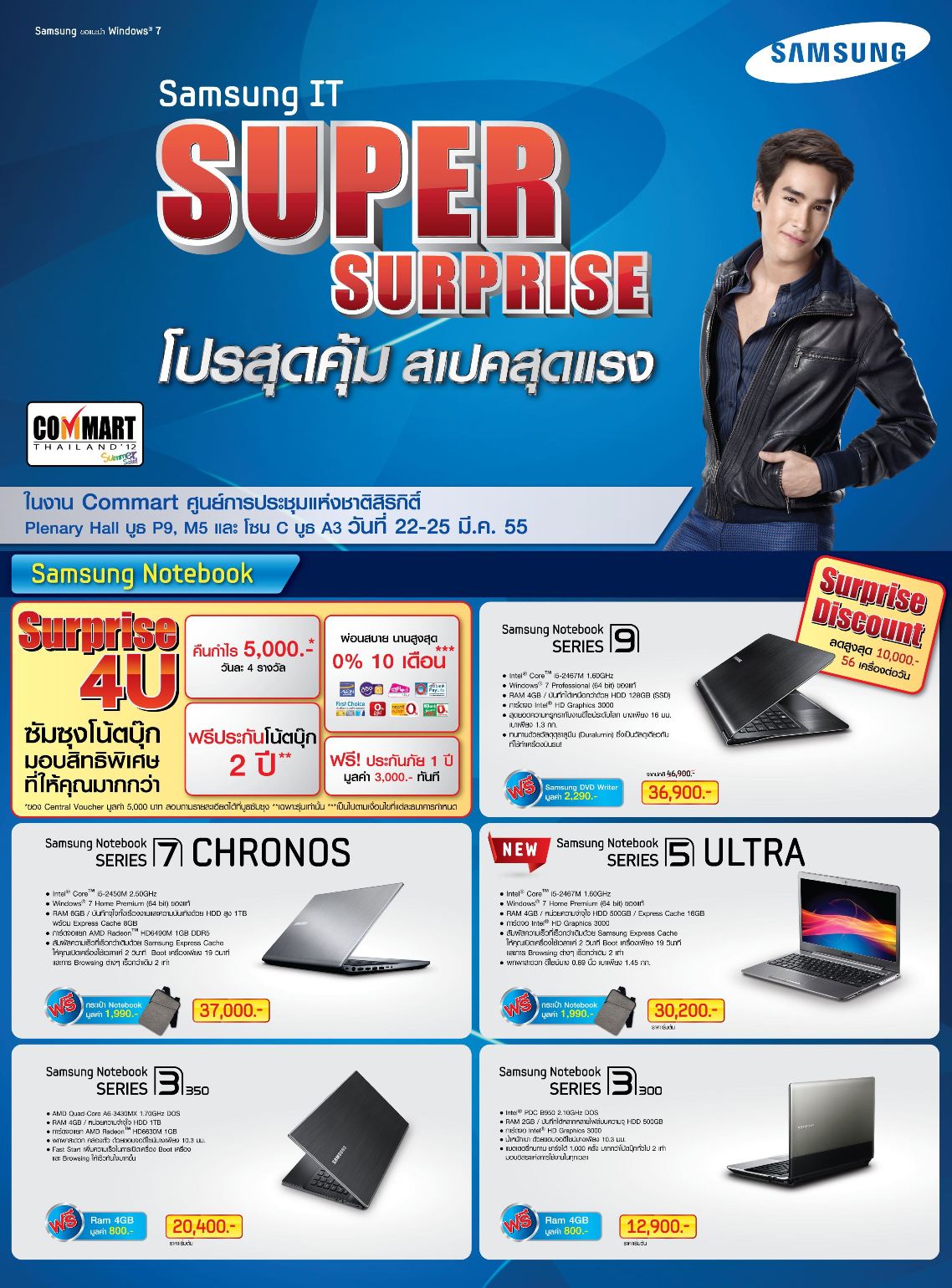 นายบุญเลิศ วิบูลย์เกียรติ ผู้อำนวยการธุรกิจไอที บริษัท ไทยซัมซุง อิเลคโทรนิคส์ จำกัด เปิดเผยว่า ”ซัมซุงได้ขนทัพผลิตภัณฑ์ไอทีใหม่ล่าสุดบุกงาน“คอมมาร์ท ไทยแลนด์ 2012″ อย่างยิ่งใหญ่ภายใต้สุดยอดแคมเปญ “ซูเปอร์ เซอร์ไพรส์ (Super Surprise) - โปรสุดคุ้ม สเปคสุดแรง” ซึ่งประกอบด้วยเซอร์ไพรส์ ดิสเคาน์ (Surprise Discount) ข้อเสนอราคาพิเศษที่ลดสูงสุดถึง 10,000 บาท ตามด้วย แบ็ค เซอร์ไพรส์ (Back Surprise) คืนกำไรมากถึง 5,000 บาท / รางวัล ผ่อนชำระดอกเบื้ย 0% สูงสุดนานถึง 10 เดือน พร้อมฟรีประกันภัยโน้ตบุ๊ค 1 ปี มูลค่า 3,000 บาท และ กิฟวิ่ง เซอร์ไพรส์ (Giving Surprise) ที่ซัมซุงพร้อมมอบของสมนาคุณ แบบดับเบิ้ลแก่ผู้บริโภค”