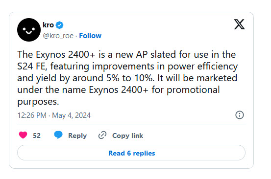 วันนี้ก็มีรายงานข่าวจากทาง Samsung ออกมาให้เราได้ชมกันครับกับข่าวที่ทางซัมซุงพัฒนาชิปรุ่นปรับปรุง Exynos 2400+ สำหรับใช้งานใน Galaxy S24 FE รุ่นใหม่ที่จะเปิดตัวในช่วงปลายปีนี้ หลังจากเมื่อไม่กี่เดือนที่ผ่านมาได้ทำการเปิดตัวชิป Exynos 2400 ที่ใช้งานใน Galaxy S24 และ Galaxy S24 Plus เวอร์ชันต่างๆ สำหรับชิป Exynos 2400+ สำหรับใช้งานใน Galaxy S24 FE รุ่นใหม่นั้นจะมีการพัฒนาในเรื่องของพลังงานที่ประหยัดพลังงาน 5-10% จากชิปรุ่นเดิม แต่ในเรื่องประสิทธิภาพความแรงนั้นเรายังไม่มีข้อมูลในส่วนนี้จากการเปิดเผยผ่าน X ของทาง kro ก็รอดูกันครับว่าชิป SOC Exynos 2400+ สำหรับใช้งานใน Galaxy S24 FE นั้นจะแรงขึ้นและกินไฟน้อยลงมากเพียงใดน่าติดตามครับ