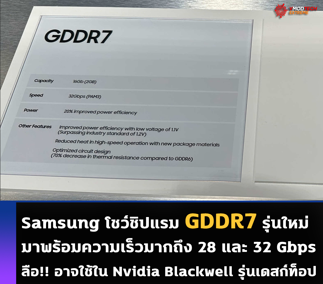 วันนี้ก็มีข่าวจากฝั่ง Samsung มาอัพเดทให้ทุกท่านได้ชมกันครับกับข่าวของชิปแรมรุ่นใหม่ GDDR7 ที่มาพร้อมความเร็วมากถึง 28 และ 32 Gbps จากการเปิดเผยของทาง hardwareluxx ที่ได้พบชิปดังกล่าวในงาน GTX2024 โดยแสดงให้เห็นว่ามีชิป GDDR7 ที่มีความจุ 2 GB ต่อหน่วย กับความเร็วสูงสุดที่ 32 Gbit/s ซึ่งเพิ่มขึ้น 33% เมื่อเทียบกับ GDDR6X รุ่นปัจจุบัน แต่ก็จะมีชิป GDDR7 รุ่นเริ่มต้นที่จะถูกใช้งานที่ความเร็ว 28 Gbit/s ซึ่งจะลดการเพิ่มประสิทธิภาพลงเหลือ 17% ถ้าเทียบจากชิปตัวท็อป GDDR6X แต่ในด้านของการใช้พลังงานGDDR7 ใช้ไฟเพียง 1.1 V แต่สำหรับรุ่น GDDR6X รุ่นท็อปทำงานที่ 1.35 V ซึ่งก็หมายถึง GDDR7 กินไฟน้อยลงแต่แรงขึ้น และก็มีข่าวลือว่า Nvidia จะใช้ชิปแรม GDDR7 ในการืดจอรุ่นใหม่ Blackwell เช่นเดียวกันครับ ก้รอดูกันครับว่าแรมใหม่จะใช้รุ่นใดแบบใด GDDR7 หรือ HBM3 น่าติดตามครับ