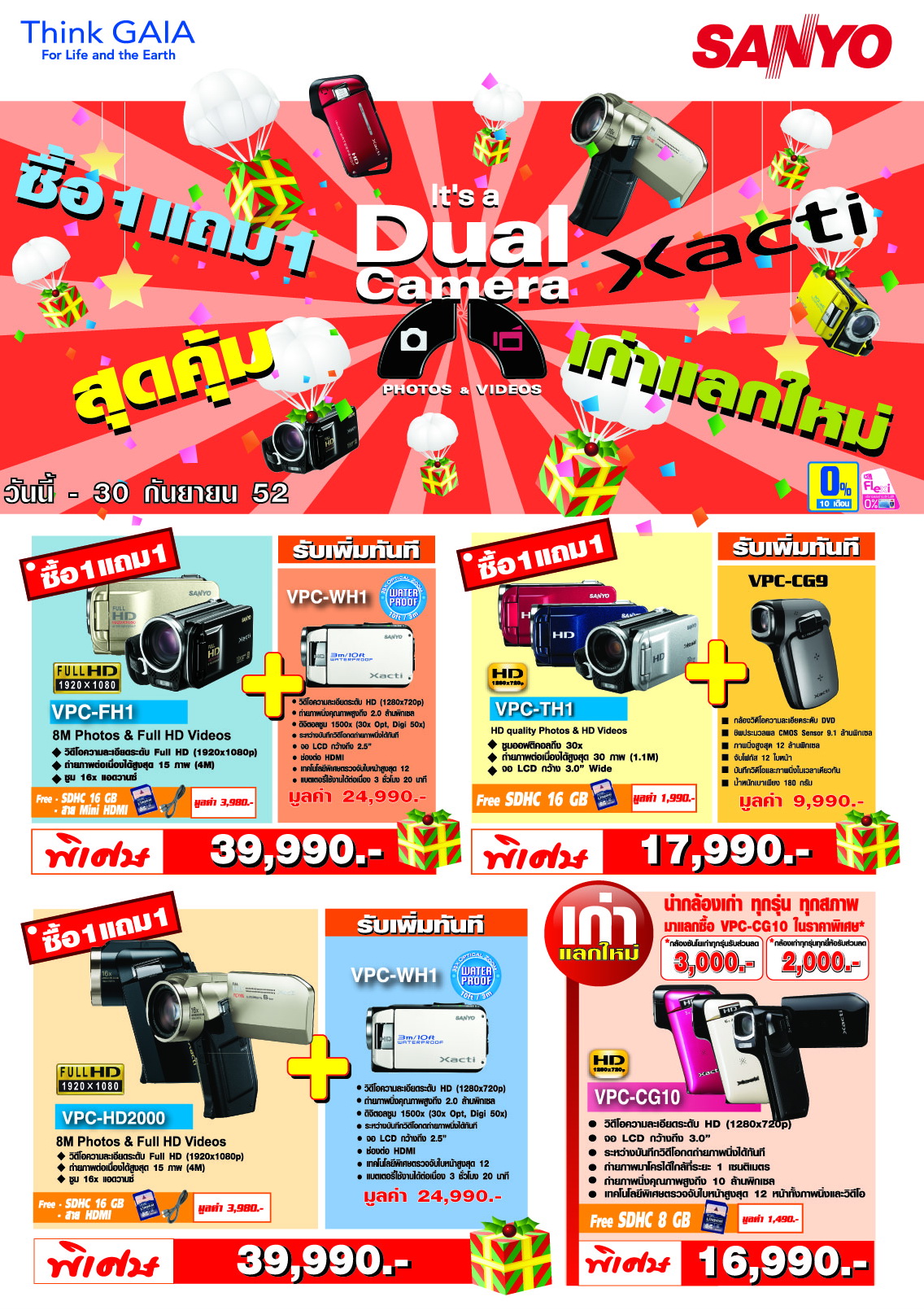 สำหรับโปรโมชั่นเฉพาะเดือนกันยายนนี้ ได้แก่ ซื้อ 1 แถมอีก 1 ฟรี เมื่อซื้อกล้องตระกูล “Xacti” รุ่น VPC-FH1 หรือ VPC-HD2000 ราคา 39,990 บาท (จำนวนจำกัดรุ่นละ 50 ตัวเท่านั้น) รับฟรีทันที กล้องรุ่น VPC-WH1 สามารถดำน้ำลึก 3 เมตร มูลค่า 24,990 บาท หรือ เมื่อซื้อรุ่น VPC-TH1 ราคา 17,990 บาท (จำนวนจำกัด) รับฟรีทันทีกล้องรุ่น VPC-CG9 มูลค่า 9,990 บาท และทั้ง 3 รุ่นยังแถมฟรี SD Card 16 GB อีกด้วย