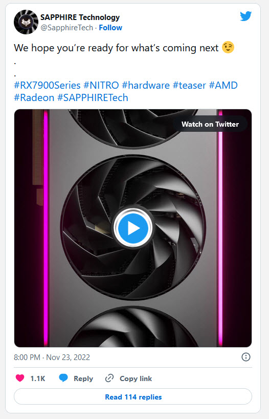 วันนี้ก็มีข่าวจากฝั่ง Sapphire ที่ได้เผยภาพวีดีโอผ่านทางทวิตเตอร์ออกมาให้ได้ชมกันครับกับภาพการ์ดจอ Sapphire Radeon RX 7900 NITRO รุ่นใหม่ล่าสุดที่มาพร้อมแสงไฟ LED-illuminated cooler ดีไซน์ใหม่ให้อย่างสวยงามอลังการพร้อมพัดลมระบายความร้อน 3ชุด โดยคาดว่าทาง Sapphire จะเปิดตัวพร้อมกันสองรุ่นก็คือ RX 7900 XT และ RX 7900 XTX ในซีรี่ย์ NITRO ในวันที่ 13 ธันวาคมที่จะถึงนีั้ครับ