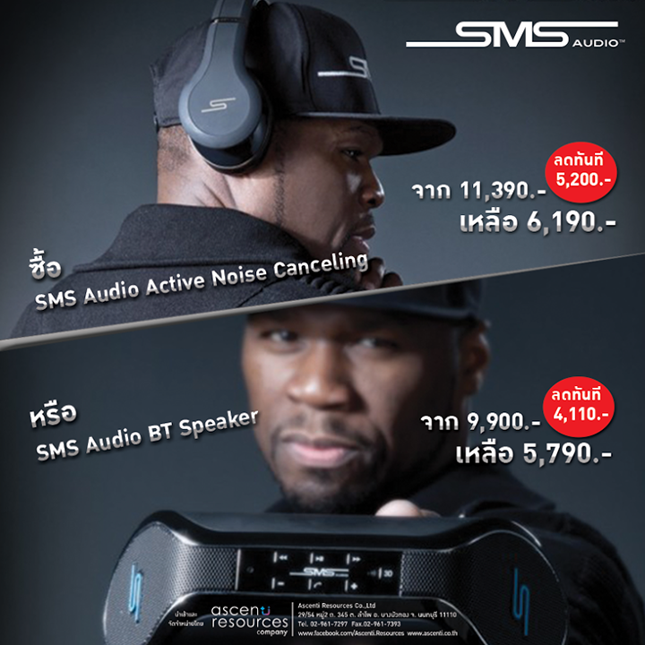 SMS Audio จัดโปรโมชั่นสุด SMS Audio Active Noise Canceling จาก 11,390 เหลือเพียง 6,190 และ SMS Audio BT Speaker จาก 9,900 เหลือเพียง 5,790 เพื่อให้ทุกท่านได้ประสบการณ์ใหม่ที่จะทำให้เพลิดเพลินไปกับเสียงเพลงที่สามารถทำให้คุณรู้สึกเหมือนอยู่คนเดียวกับ SMS Audio รุ่น Active Noise Canceling หรือ จะอยู่กันหลายคนก็สามารถพบกับเสียงแบบ 360° กับ SMS Audio รุ่น BT Speaker