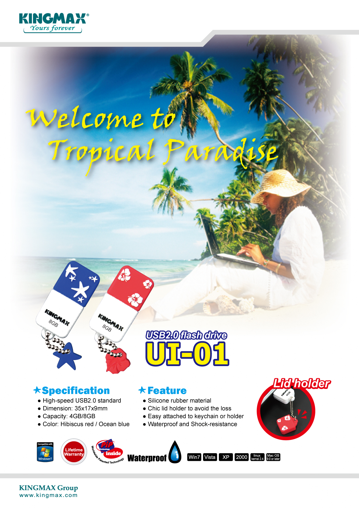 Taipei, TAIWAN, 03/15/2011 - KINGMAX, a renowned leading memory module and USB flash drive manufacturer, has taken the lead in launching its 2011 “ocean paradise” UI-01 USB flash drive, enchanted with the feeling of a tropical island. Adopting environmentally compliant quality rubber that complements the UI-01’s exquisite shape, eye-catching colors and a unique snap-on lanyard, the UI-01 USB flash drive proves to be a fun, indispensible item to be added to your digital arsenal. Complete with KINGMAX’s exclusively patented COB (Chip-on-Board) technology - PIPTM, the UI-01 USB flash drive is a rugged storage device that resists damage from spill, dust and shock, protecting your data while sporting a chic look.