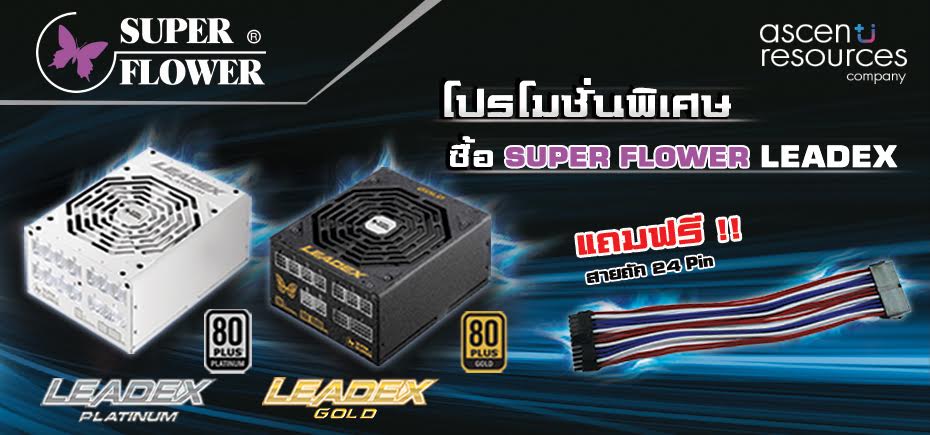 Super Flower ร่วมกับ Ascenti Resources จัดโปรโมชั่นพิเศษ !! เมื่อซื้อพาวเวอร์ซัพพลาย Super Flower รุ่น LEADEX Platinum หรือ LEADEX Gold ทุกขนาดวัตต์ แถมฟรี สายถักเพิ่มความยาว 24P ลายสวยงาม 1 เส้น สำหรับโปรโมชั่นนี้ตั้งแต่วันนี้ จนถึงสิ้นเดือนสิงหาคม 2558 หรือ จนกว่าของแถมจะหมด มีจำนวนจำกัด !!