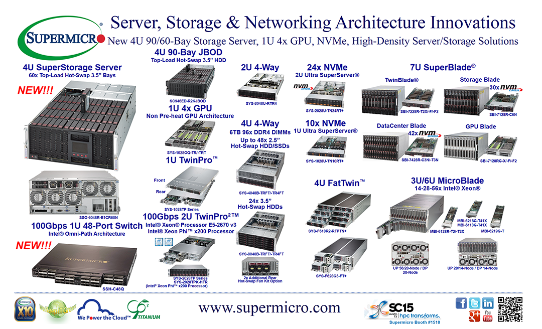 · 2U 4-Way SuperServer® (SYS-2048U-RTR4) – supporting 4x Intel® Xeon® processor E5-4600 v3 and 4x Intel® Xeon Phi™ coprocessors, up to 3TB ECC, up to DDR4 2133MHz in48x DIMM slots, 9x PCI-E 3.0 (x8) slots, 2x PCI-E 3.0 (x16) slots, 4x GbE + 1x dedicated IPMI LAN ports, 24x hot-swap 2.5″ drive bays + 4x hybrid ports with NVMe support via extra AOC