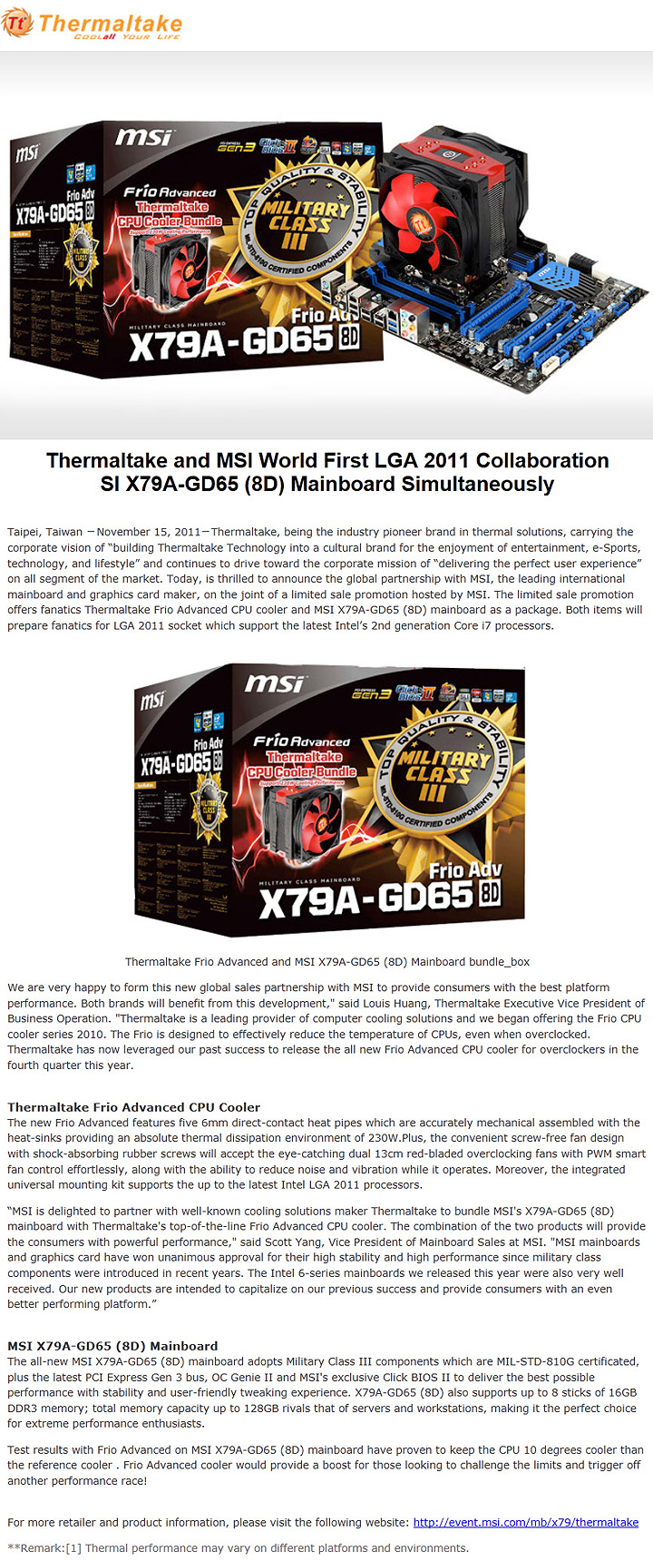 ทาง Thermaltake ได้ร่วมมือกับ MSI ทำการผนวกเอาระบบระบายความร้อนของ Thermaltake รุ่น Frio Advanced รวมไว้กับ Motherboard X79A-GD65 (8D) ทำให้ผู้ที่ซื้อ Motherboard ไปสามารถทำการ Overclock ได้อย่างสบายใจมากขึ้นครับ