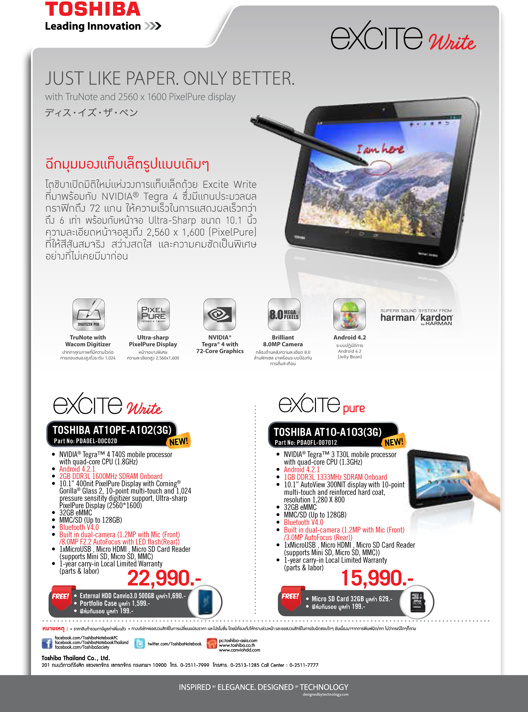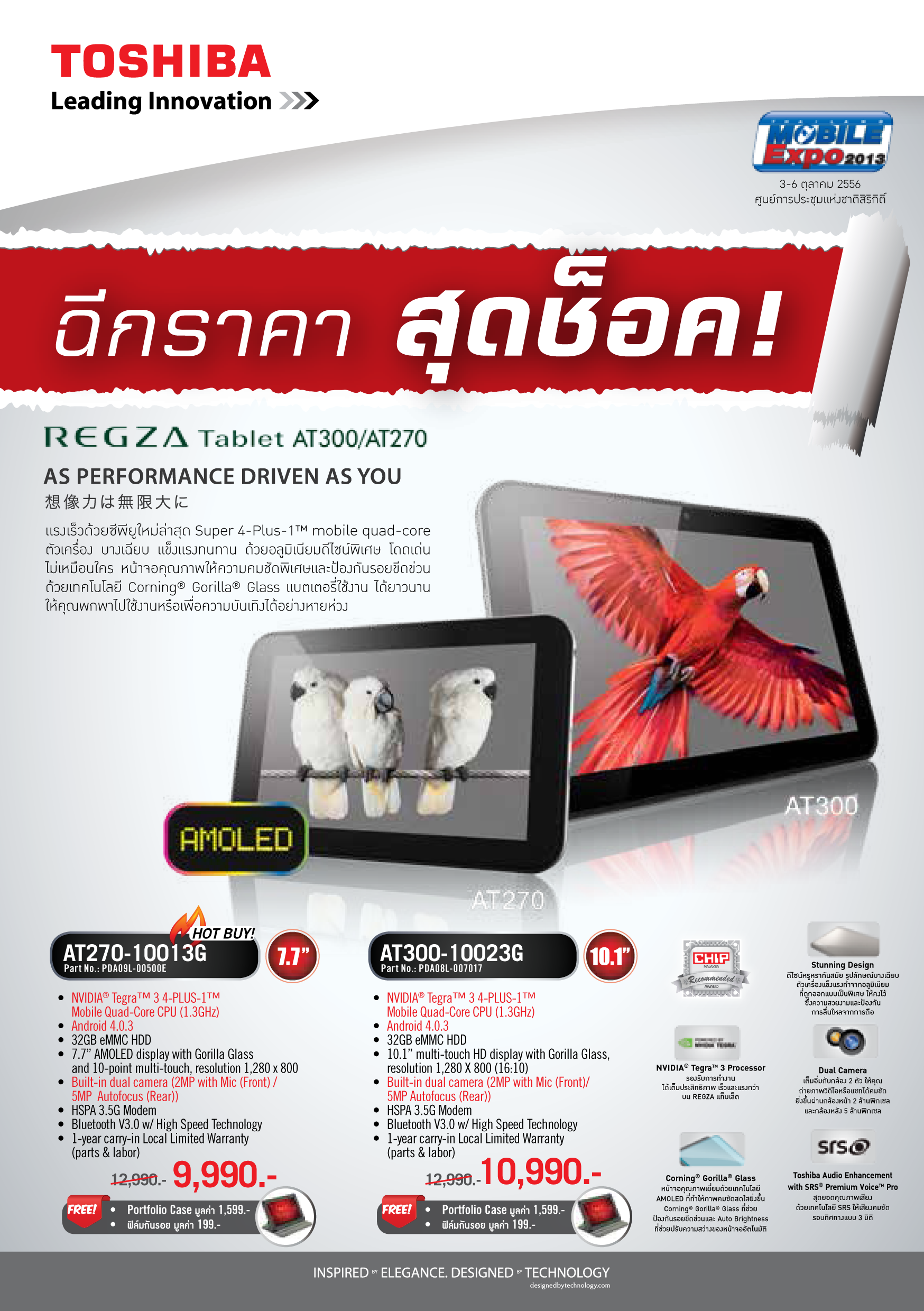 โตชิบา ฉีกราคาสุดช็อค! แท็บเล็ตราคาเริ่มต้นเพียง 9,990.- และรับของแถมสุดพิเศษ มูลค่ารวมกว่า 3,480.- (เมื่อซื้อรุ่นที่กำหนด) ในงาน Mobile Expo 2013