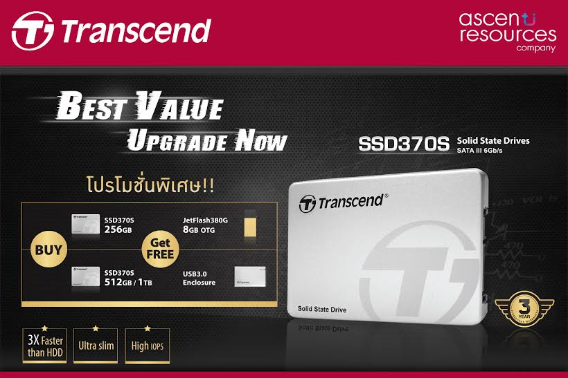 บริษัท เอสเซนตี้ รีซอร์สเซส จำกัด ผู้นำเข้าและจัดจำหน่าย Solid State Drive ชั้นนำของโลกยี่ห้อ Transcend Ascenti Resources ร่วมกับ Transcend จัดโปรโมชั่นสุดคุ้มเมื่อซื้อ SSD370S