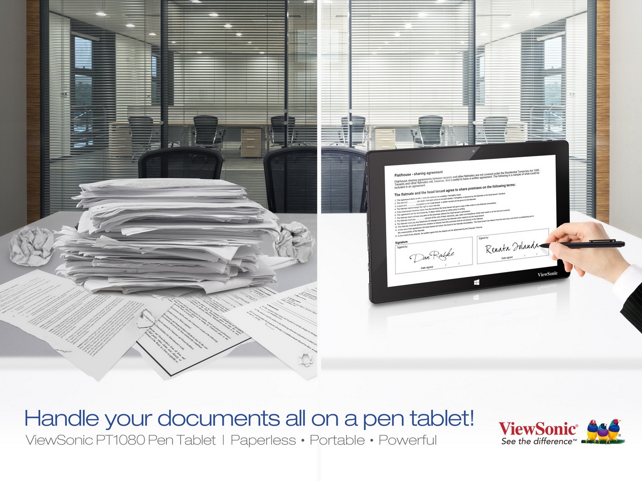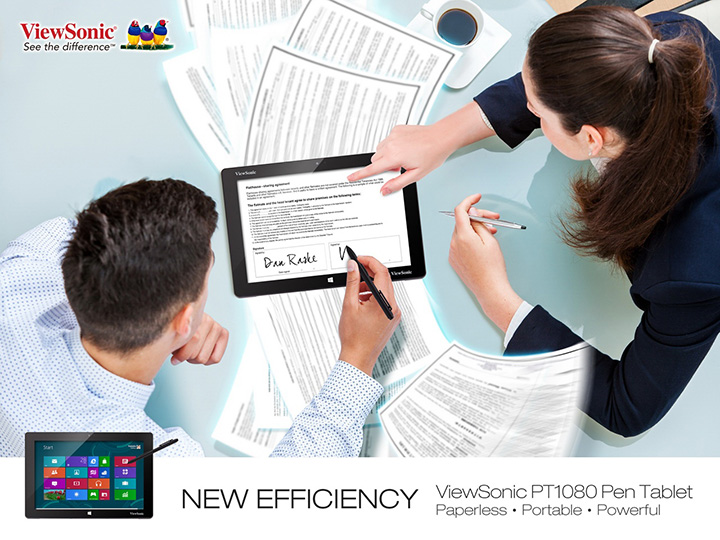 15 กันยายน 2015 –ViewSonicCorp., ผู้นำด้านผลิตภัณฑ์ และ visual โซลูชั่น เปิดตัว PT1080 Pen Tablet ขนาดหน้าจอ 10นิ้ว รูปแบบWindows®based ผลิตภัณฑ์ที่มีการก้าวกระโดดของนวัตกรรม hardware สำหรับธุรกิจ ด้วยการผนวก palm rejection Electromagnetic Resonance Pen technology (EMP) และ หน้าจอสัมผัสแบบ 10-point touch panel เข้าไว้ด้วยกัน ViewSonic PT1080 สามารถอัพเกรดเป็น Windows 10 OS เพื่อการบริหารจัดการข้อมูลอย่างชาญฉลาด และประสบการณการใช้งานสำหรับ e-signature สำหรับลูกค้าธุรกิจ PT1080 สามารถลดขั้นตอน และบุคลากรที่ต้องประจำ counter รวมถึงสามารถออกแบบการบริการแบบ personalized ให้ตรงกับความต้องการของลูกค้ามากที่สุด ต่อยอดจากธุรกิจ และความเชี่ยวชาญ display ViewSonic PT1080 Pen Tablet ขนาด 10-นิ้ว ได้พิสูจน์แล้วว่า สามารถทำให้การบริหารจัดการข้อมูลได้มีประสิทธิภาพมากขึ้น การบริการแบบ mobility and accessibility และ เพิ่มความพึงพอใจโดยรวมของลูกค้าสำหรับธุรกิจ