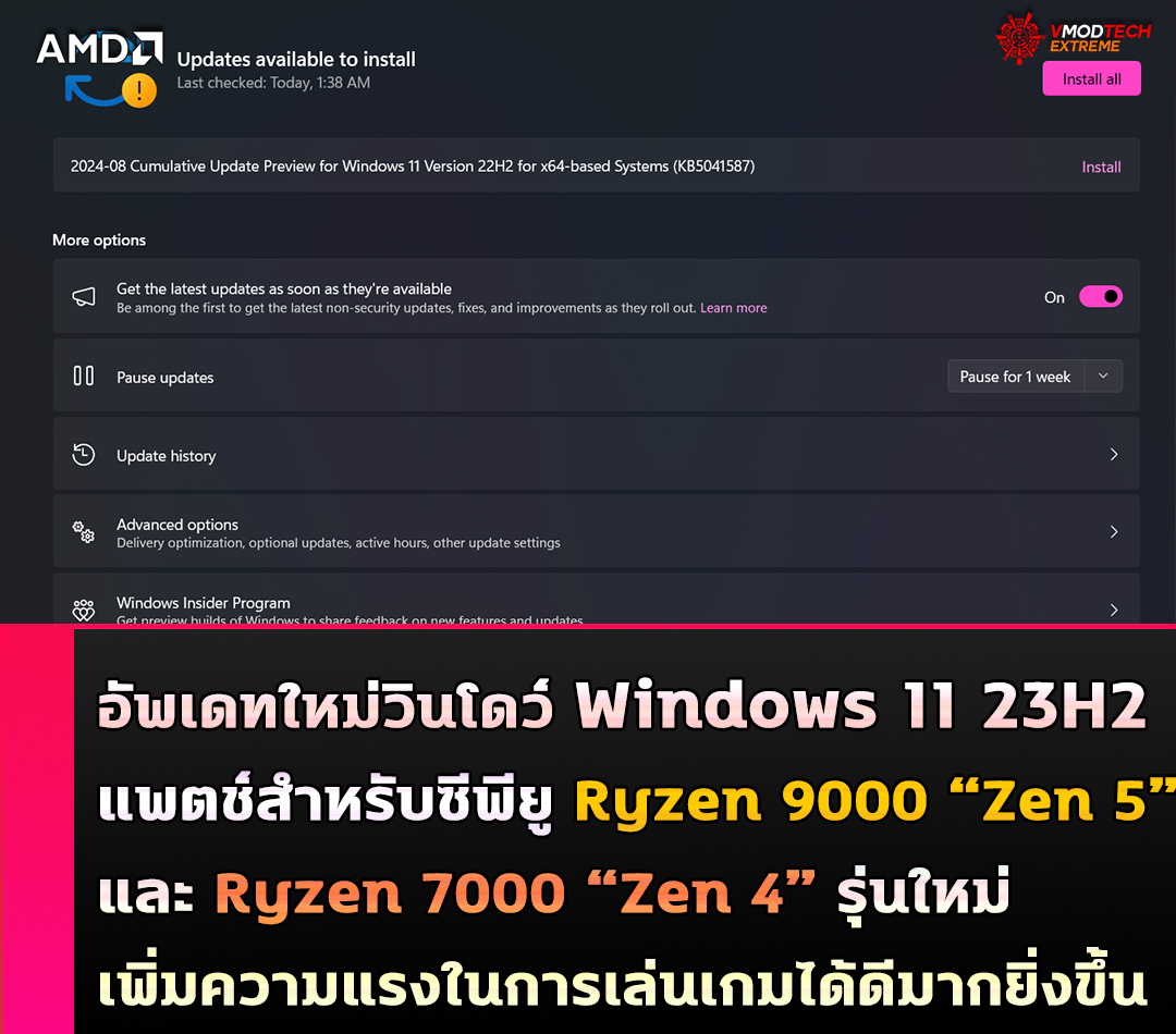 อัพเดทใหม่วินโดว์ Windows 11 23H2 พร้อมรองรับประสิทธิภาพที่เพิ่มขึ้น Prediction Optimization แพตช์สำหรับซีพียู Ryzen 9000 “Zen 5” และ Ryzen 7000 “Zen 4” เพิ่มความแรงในการเล่นเกมได้ดีมากยิ่งขึ้น