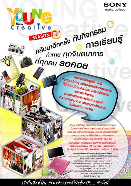 กลุ่มบริษัทโซนี่ในประเทศไทย ร่วมใจกันจัดกิจกรรมเพื่อสังคม มุ่งเน้นพัฒนาความคิดสร้างสรรค์ของเยาวชนต่อเนื่องเป็นปีที่ 3 ในโครงการค่ายความรู้ “Young Creative by Sony Season 3″ ภายใต้แนวคิด make.believe เปิดโอกาสให้เยาวชนไทยทั่วประเทศ ที่สนใจในเรื่องของเทคโนโลยี และการถ่ายภาพ ได้สมัครเข้าร่วมกิจกรรมสัมมนาเชิงบฏิบัติการ เพื่อเรียนรู้วิธีการสร้างสรรค์ผลงานด้วยอุปกรณ์และเทคโนโลยีใกล้ตัว พร้อมทั้งฝึกทักษะการทำงานร่วมกันเป็นทีม ในกิจกรรมท้าทายความคิดสร้างสรรค์ และสนุกสนาน โดยในปีนี้จะเน้นในเรื่องเทคโนโลยีการถ่ายภาพ ซึ่งเยาวชนจำนวน 100 คนที่ได้รับการคัดเลือก จะได้ศึกษาเบื้องหลังการทำงานจริงของช่างภาพมืออาชีพ พร้อมทั้งเรียนรู้วิธีการ และเทคนิคการถ่ายภาพด้วยกล้องดิจิตอล เอสแอลอาร์ และร่วมปฏิบัติการในกิจกรรมเวิร์คช็อปตามภารกิจที่ได้รับมอบหมาย เพื่อสร้างสรรค์แนวคิดและผลงาน อันจะนำไปสู่แรงบันดาลสู่ความเป็นมืออาชีพในอนาคต ทั้งนี้ จากความสำเร็จในการจัดงาน 2 ครั้งที่ผ่านมา ในปีนี้โซนี่จึงได้ขยายโครงการโดยเปิดโอกาสให้เยาวชนได้เข้าร่วมโครงการเพิ่มขึ้นเป็นจำนวน 100 คน จากเดิมเพียง 80 คน