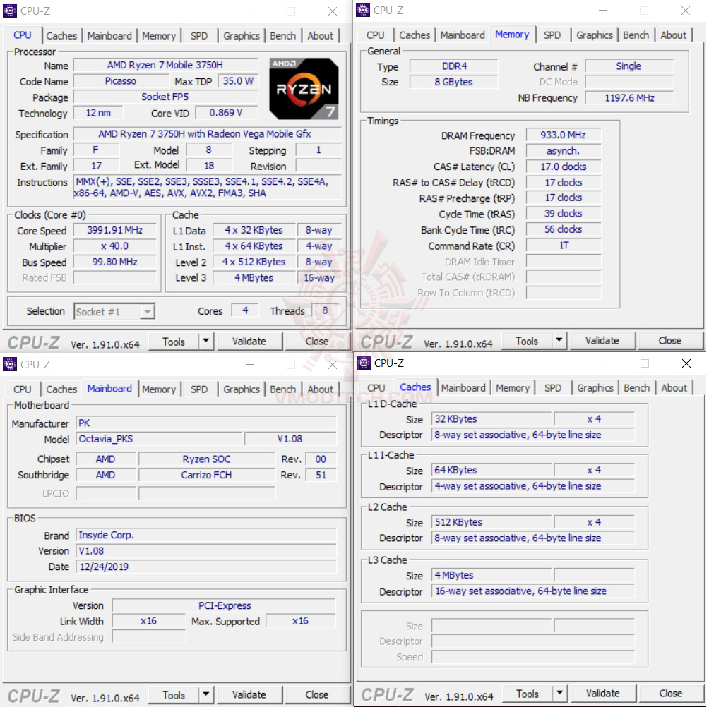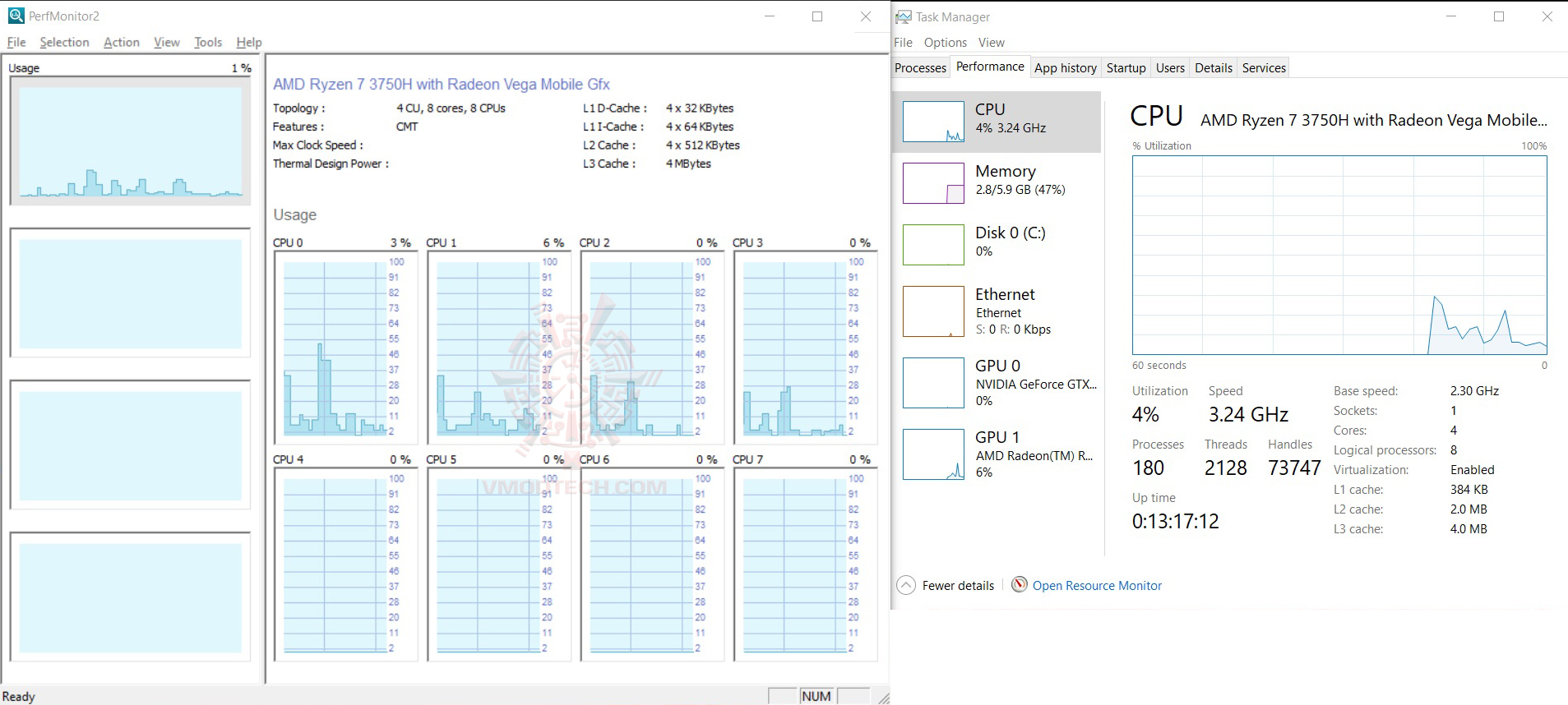 สเปกซีพียูที่ใช้งานก็คือ AMD Ryzen™ 7 3750H quad-core processor (2 MB L2 cache,4 MB L3 cache, 2.3GHz up to 4.0GHz) ไฟเลี้ยงซีพียู Vcore 1.13V บัสแรม RAM 8GB DDR4 ความจุแรมสุงสุดที่อัพเกรดได้ให้มากถึง 32GB แรงเยี่ยมเลยทีเดียว