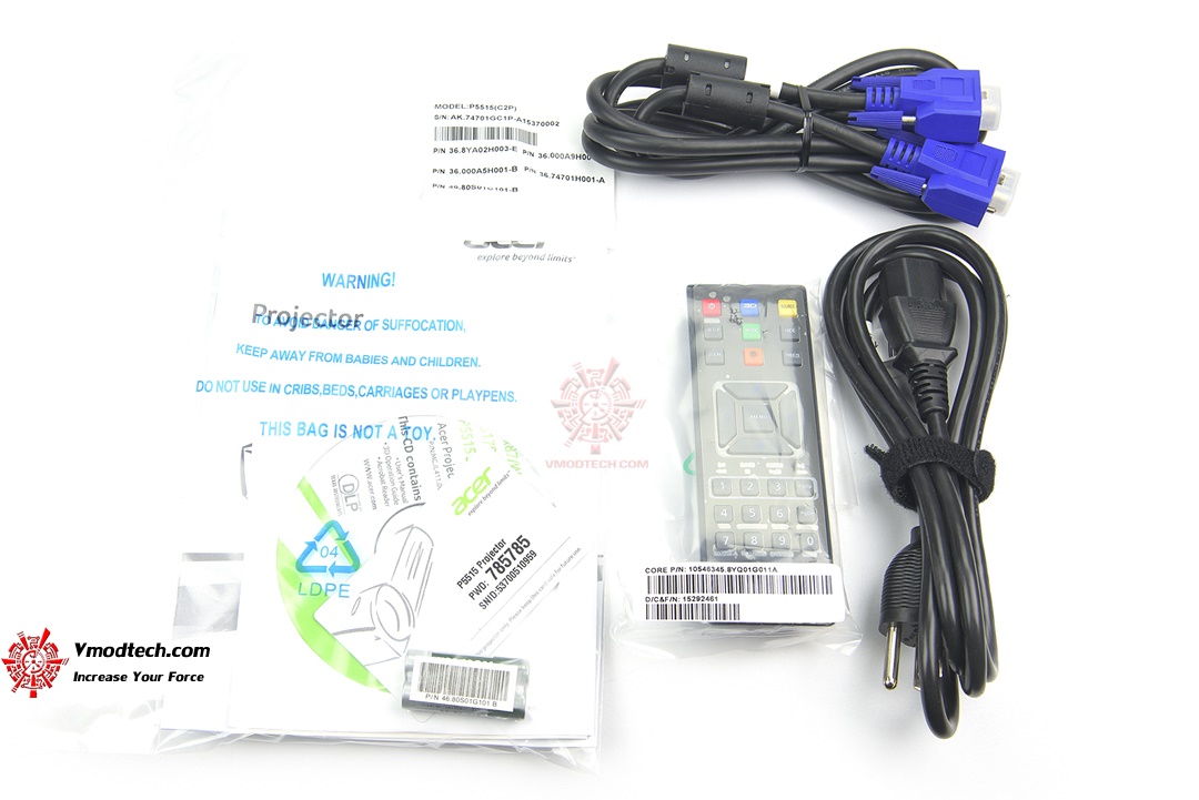 ด้านในกล่องนั้นจะมีคู่มือ สาย D-SUB สายไฟ AC มาให้ รวมถึงรีโมทอีกหนึ่งอัน