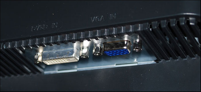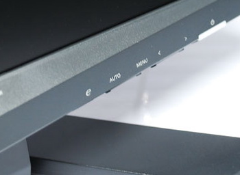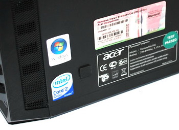 สติกเกอร์ต่างๆบ่งบอกรายละเอียดรุ่นและlicense key วินโดว์วิสต้า บิสซิเนสติดไว้ข้างเคส ส่วนภาพด้านขวาก็เป็นปุ่มควบคุมการใช้งานlcd กดใช้งานได้สะดวกดี พอร์ทเชื่อมต่อของlcd มีมาให้เพียง DVI และ D-sub เท่านั้น