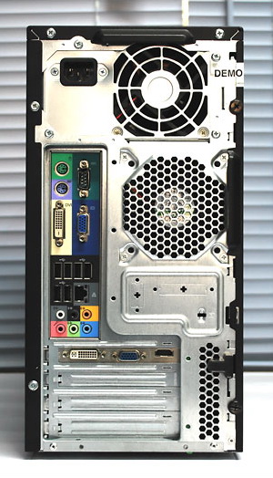 ด้านหน้าดำสลับเทาใต้เส้นคาดสีเทาๆจะเป็นรูตะแกรงระบายความร้อน ส่วนด้านหลังพอร์ทต่างๆมีมาให้เป็นdvi d-sub ออนบอร์ดและการ์ดจอแยกจากATi มีพอร์ทhdmi มาให้ด้วย usb6ช่อง sound/Lan Serial Portและพอร์ทPS/2ครบถ้วนตามมาตรฐาน