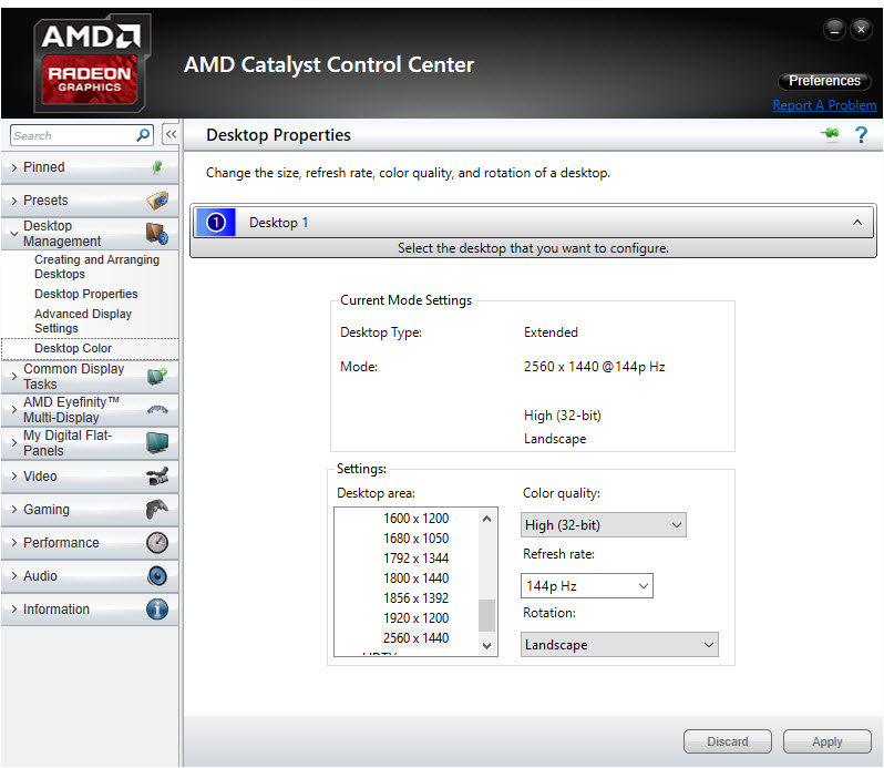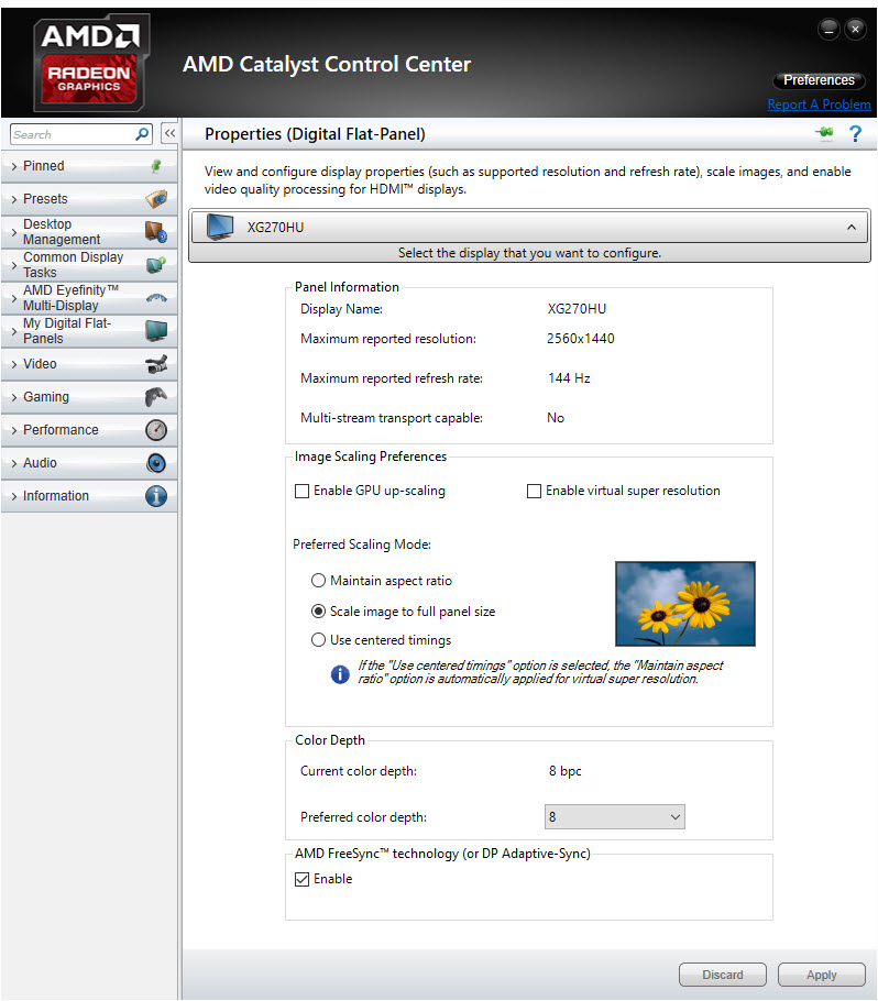 หน้าจอของ AMD CCC นั้นแสดงรายละเอียดของจอรวมถึงการใช้งาน AMD FreeSync ด้านล่างสุด