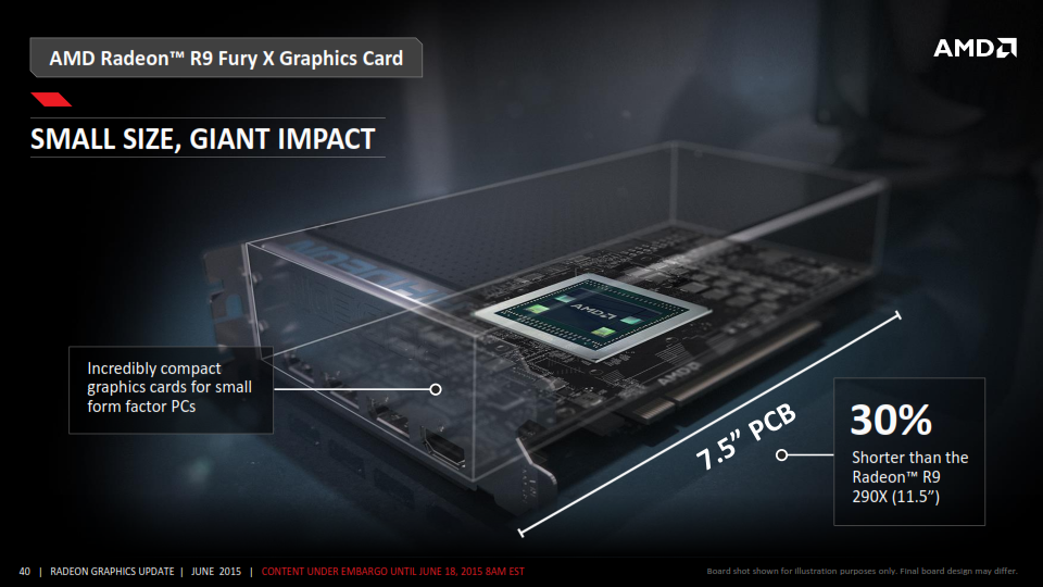 เรามาชมในส่วนของฟีเจอร์และตัวการ์ดกันต่อเลยครับว่าจะมาในรูปร่างแบบไหน ดีไซน์ไหน ตามที่ผมได้กล่าวไปแล้วครับว่าทาง AMD ได้นำเอาเทคโนโลยี HBM มาใช้ใน AMD RADEON FURY X ทำให้การใช้พื้นที่เม็ดแรมที่สิ้นเปลืองนั้นจะหมดไป ก็หมายความว่าพื้นที่ของตัวการ์ดนั้นจะลดลง ซึ่งในสมัยก่อนเราจะคิดว่าการ์ดใบใหญ่จะต้องเป็นรุ่นท๊อปและแรงมีประสิทธิภาพมากกว่าใบเล็กๆ(ถ้านับกันตามซีรี่ย์นะครับ) แต่ ณ เวลานี้ทาง AMD ปฎิวัติใหม่ครับโดยการนำเจ้าแรม HBM (High Bandwidth Memory) ที่เป็นการติดตั้งเม็ดแรมลงรอบๆ GPU DIE หรือบน Interposer เพื่อง่ายต่อการส่งถ่ายข้อมูลและการประหยัดพื้นที่เพิ่มมากขึ้นอีกด้วย ทำให้ตัวกราฟฟิการ์ด AMD RADEON FURY X จะมีขนาดที่เล็กลงอย่างมากครับ เพราะพื้นที่เม็ดแรมไม่ต้องไปติดตั้งลงไปที่ PCB เหมือนในรุ่นก่อนๆหรือกราฟฟิการ์ดในสมัยก่อนนั่นเอง เดี๋ยวเราไปชมกันครับว่า AMD RADEON FURY X นั้นจะมีรูปร่างหน้าตาและฟีเจอร์เป็นอย่างไรกันบ้าง