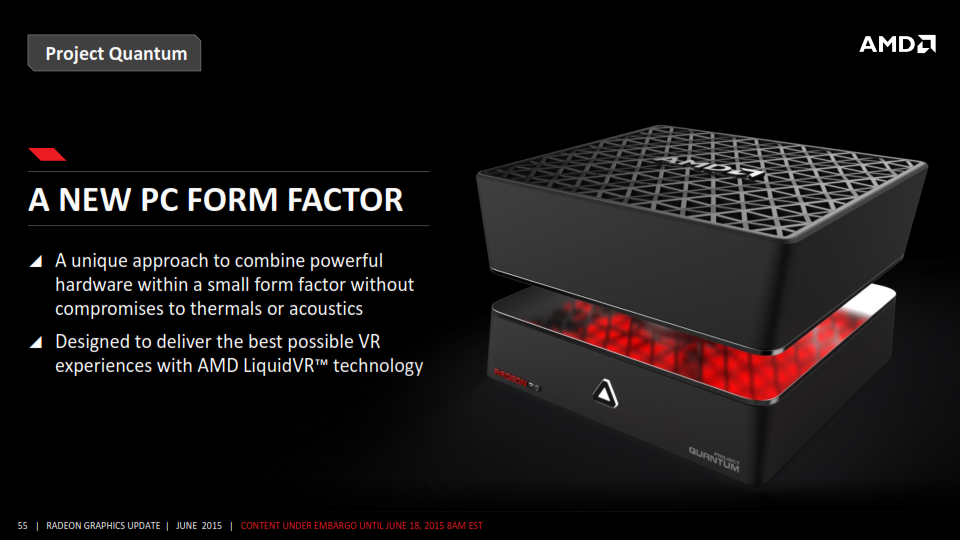 Project Quantum อีกหนึ่งโปรเจคของทาง AMD ที่ตอนนี้ยังไม่เปิดเผยรายละเอียดกันมากนักจะเป็นการนำเอา CPU , เมนบอร์ด , การ์ดจอ , ชุดระบายความร้อนด้วยน้ำ, แรม , PSU และส่วนประกอบต่างๆของ PC มาประกอบเป็น Project Quantum ซึ่งในอนาคตเราจะเห็นชุด PC แบบ All in One ของทาง AMD เปิดตัวกันในไม่ช้านี้ครับ