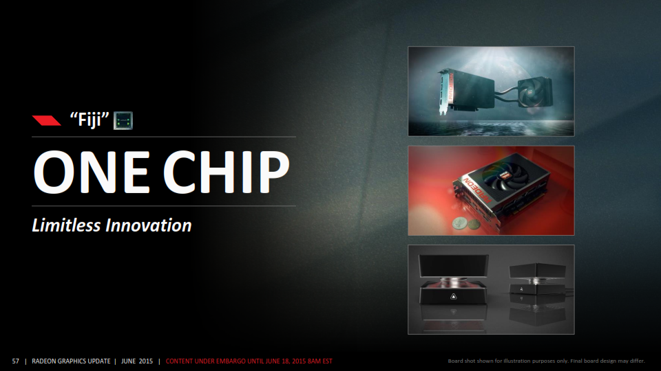 ด้วยการออกแบบที่ทันสมัยนำทุกสิ่งมาไว้ในชิพเดียวในโค๊ดเนมที่มีชื่อเรียกว่า " FIJI " ทำให้ AMD เป็นผู้ผลิตกราฟฟิกการ์ดรายแรกที่ออกแบบนวัฒกรรมที่ทันสมัยของกราฟฟิการ์ดในปัจจุบัน