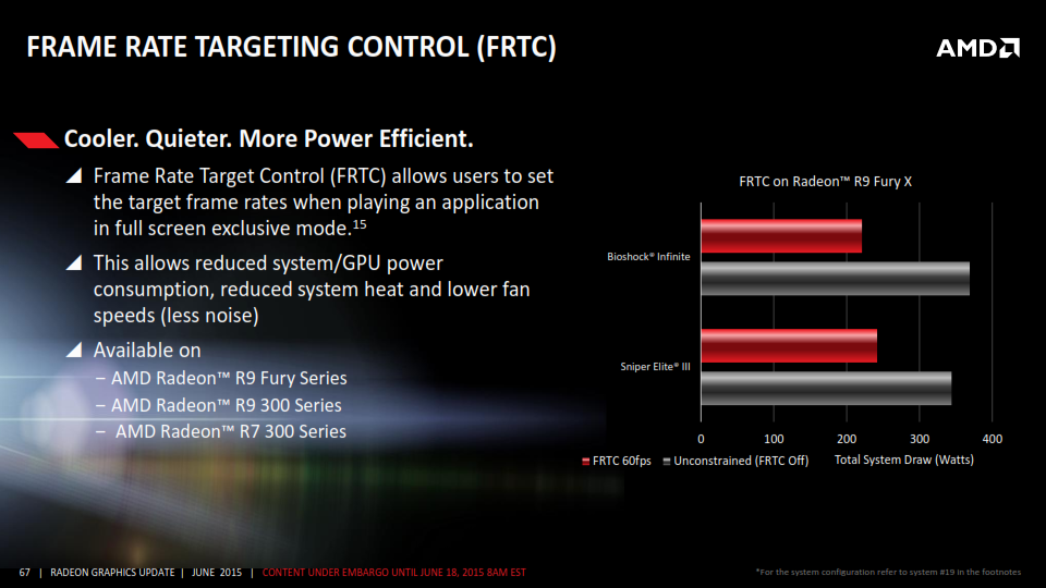 Frame Rate Target Control (FRTC) อีกหนึ่งฟีเจอร์ของทาง AMD ที่จะช่วยให้ท่านกำหนดเฟรมเรตในการใช้งานได้ครับ ก็คือเมื่อมีการเปิดใช้งาน Frame Rate Target Control (FRTC) จะทำให้อัตราการบริโภคไฟนั้นเพิ่มมากยิ่งขึ้น ยกตัวอย่างท่านเล่นเกมส์ที่รันแล้วเฟรมเรตทะลุ 80-100 Fps ทำให้อัตราการกินไฟนั้นเพิ่มมากขึ้นซึ่งมันไม่ได้มีความจำเป็นมากนักเพราะในเฟรมเรตเฉลี้ยที่ 60เฟรมเรตขึ้นไปก็ทำให้ให้เราเล่นเกมส์ได้ลื่นแล้วครับ ระบบ Frame Rate Target Control (FRTC) จะสามารถล๊อกเฟรมเรตไม่ให้พุ่งสูงเกินความจำเป็นจะเป็นการช่วยประหยัดอัตราการบริโภคไฟได้อย่างมากเลยทีเดียวครับ