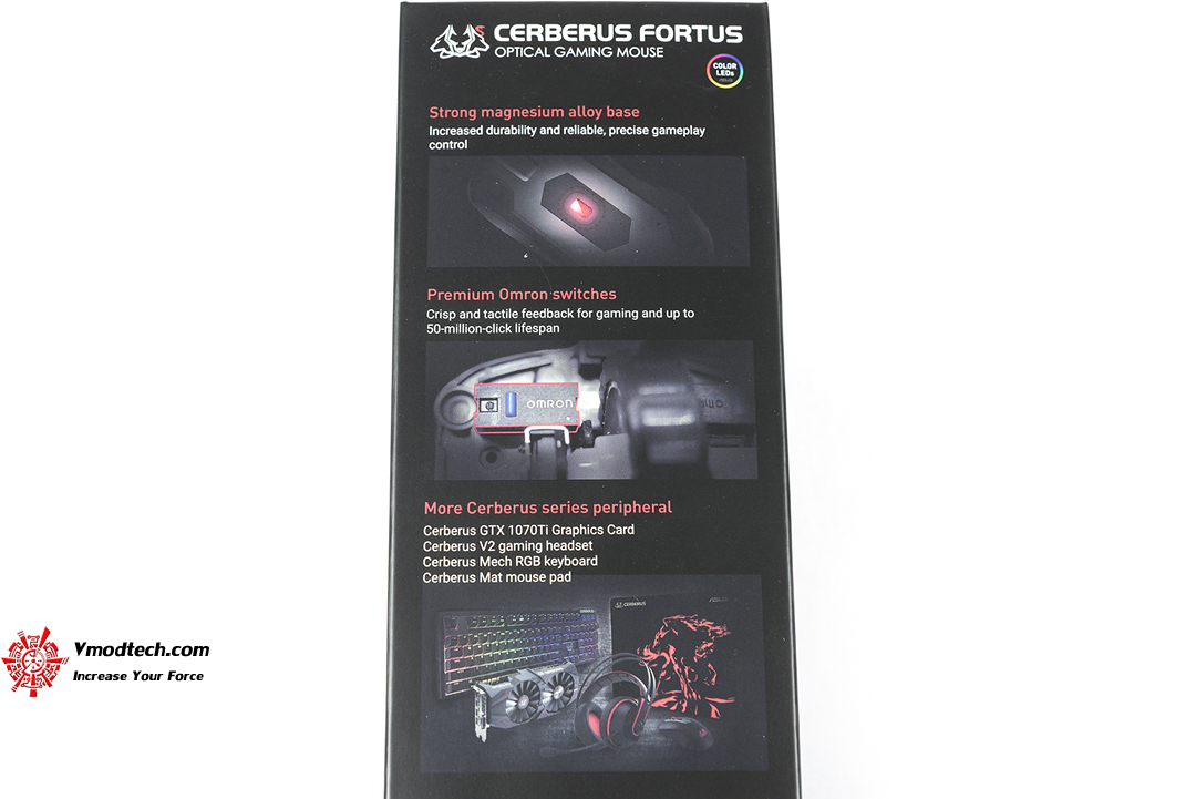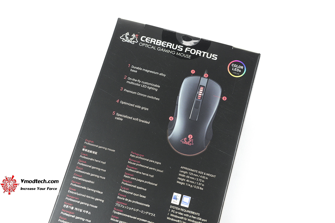 ข้างกล่องและด้านหลังจะระบุถึงคุณสมบัติหลักของมันไว้รวมถึงคอนฟิกของปุ่มต่างๆบนตัวเมาส์