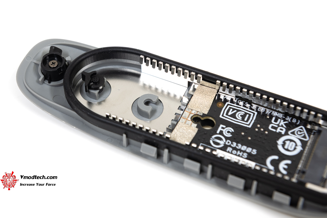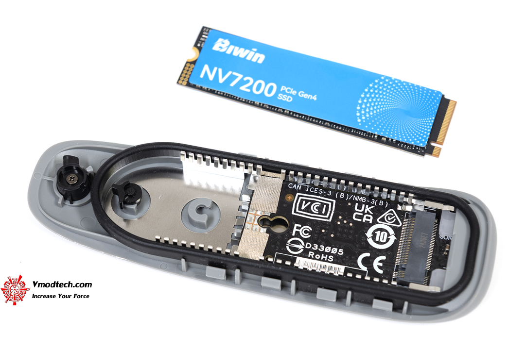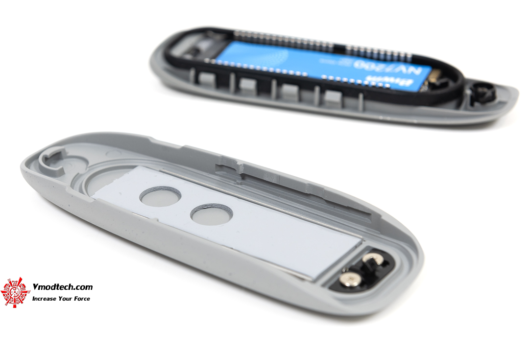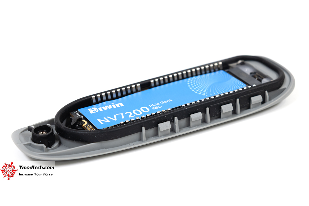 จะเห็นส่วนที่เป็นยางคลุมบริเวณห้องด้านในนะครับ ก็สามารถป้องกันน้ำได้พอสมควรแต่ไม่ใช่แช่น้ำเลยนะ อันนั้นค่อนข้างเสี่ยงหากใช้อุปกรณ์ ASUS Cobble นี้ไปซักพักแล้วยากเกิดเสื่อมขึ้นมา การเสียบ SSD ใช้งานก็ง่ายครับ ถึงขั้นตอนนี้ก็ยังไม่ต้องใช้อุปกรณ์อะไรเลย แค่เสียบ SSD เข้าไปแล้วก็ปรับระยะดีๆ แล้วบิด Q-latch ที่เป็นสีดำๆนี่ละครับเพื่อล๊อกตัว SSD เข้าไว้