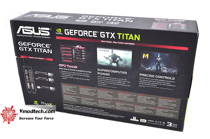 รายละเอียดด้านหลังแสดงให้เห็นถึงฟีเจอร์หรือคุณสมบัติหลักๆของกราฟฟิกการ์ด ASUS GeForce GTX TITAN
