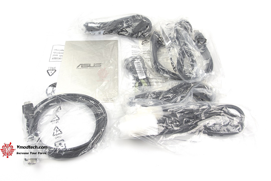 บรรดาสายที่ทาง ASUS เตรียมไว้ให้ก็จะมีสาย DVI, HDMI DisplayPort สายสัญญาณเสียง รวมถึงคู่มืออีกหนึ่งเล่มเล็กๆสำหรับแนะนำการใช้งานเบื้องต้น