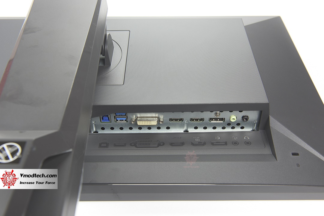 ฝั่งขวามือจะเป็นบริเวณสำหรับเชื่อมต่อสายทั้งหมด จากซ้ายไปขวจะเป็นช่องเสียบ USB ไปยังท้ายบอร์ด ถัดมาจะเป็น HUB USB 3.0 ช่องเสียบ DVI ช่องเสียบ HDMI สองช่องแบบ 1.4 และ 2.0 ต่อไปเป็น DisplayPort และที่เสียบสัญญาณเสียงจากบอร์ดมายังตัวจอและขวาสุดนั้นเอาไว้เสียบหูฟัง
