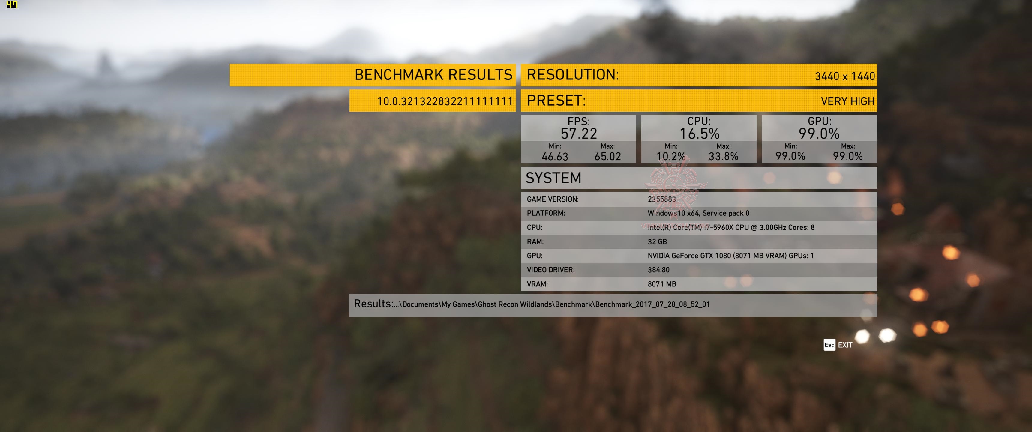 หลังจากเบนซ์มาร์คแล้วจะเห็นได้ครับว่า การปรับแต่งระดับ Very High ที่เรสโซลูชั่น 3440x1440 refresh rate ที่ 100Hz ด้วยการ์ด GTX 1080 นั้น จะได้เฟรมเรทเฉลี่ยที่ 57 เฟรมต่อวินาที และต่ำสุดที่ 47 ก็ถือว่าไม่มากไม่น้อยครับ กินการ์ดพอประมาณสำหรับรีเฟรชเรทและเรสโซลูชั่นขนาดนี้