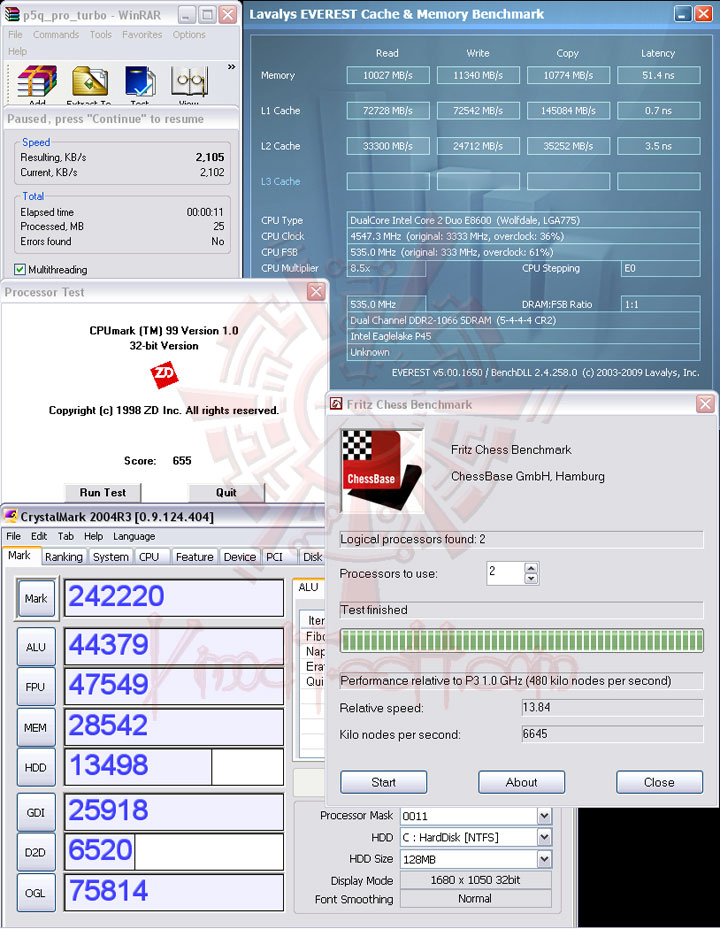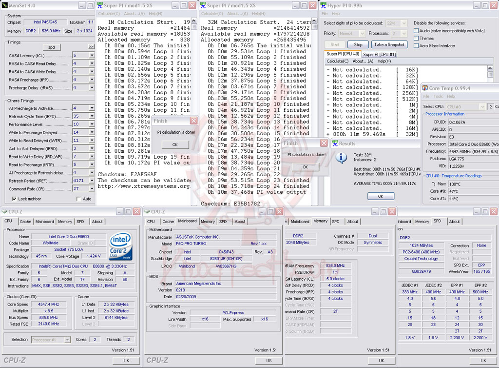 มาถึงในช่วงทดสอบความสามารถของตัวเมนบอร์ดกันแล้วนะครับ ไม่ต้องผ่านโปรแกรมใดๆเซทอัพจากในไบออสแล้วบูทเข้าระบบกันเลย ผลทดสอบเดิมๆไม่มีให้ดูเปรียบเทียบเช่นเคยตามสไตล์Vmodtech ครั้งนี้ทดสอบภายใต้ระบบระบายความร้อนด้วยอากาศ โดยเลือกใช้TrueBlack120มาดับร้อนให้กับซีพียู Intel E8600 ส่วนวีจีเอการ์ดก็เป็นรุ่นเล็กGTX295 core/mem 710/1242 ในห้องไม่มีเครื่องปรับอากาศนะครับ อุณหภูมิโดยรอบก็30-32องศาในตอนกลางคืน กลางวันนั่งเทสไม่ได้ครับต้องหนีไปเดินห้างตากแอร์..อิอิ ความเร็วที่ทำได้ในการทดสอบครั้งนี้มาหยุดที่ 4.547GHz FSB535x8.5 Cl 5-4-4-4 ใช้ความเร็วนี้ตลอดทุกการทดสอบนะครับ ซึ่งก็เป็นความเร็วที่สามารถใช้งานได้อย่างมีสเถียรภาพแม้ในห้องที่ไม่ติดตั้งเครื่องปรับอากาศ