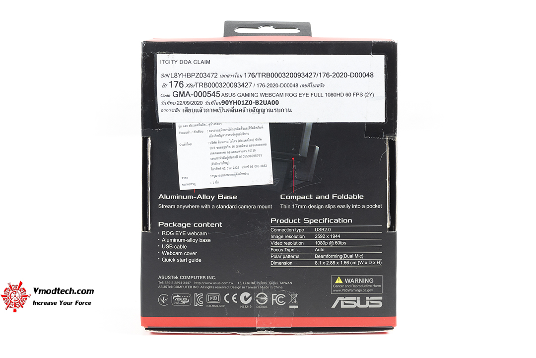 ตัวกล่องบรรจุ ROG EYE นั้นมีขนาดเล็ก ดีไซน์ด้วยโทนสีแดงคุมโทนของ ROG ด้านหลังมีรายละเอียดของตัว Webcam ไว้ด้วยครับ คือถ้าถ่ายรูปนิ่งจะได้ความละเอียดที่ 2592 x 1944 แต่ถ้าเป็นวีดีโอจะได้ที่ 1920 x 1080 ที่รีเฟรชเรท 60 Hz ครับ