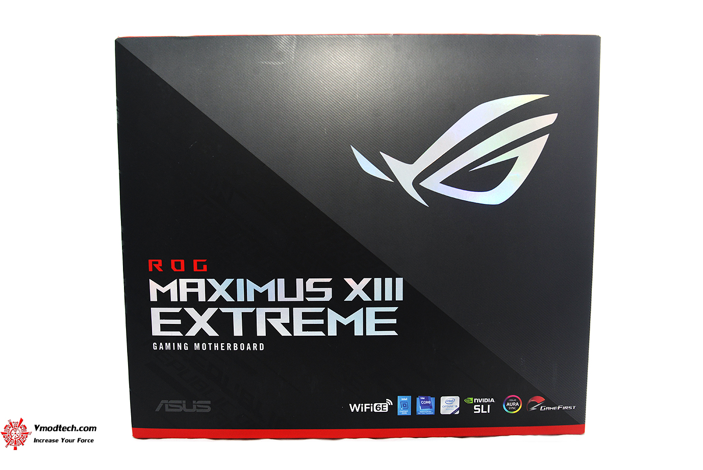 ตัวกล่องเมนบอร์ด ASUS ROG MAXIMUS XIII EXTREME มาในแนวสีดำสนิทตามสไตล์ ROG MAXIMUS ซึ่งแทบไม่แตกต่างจากรุ่นก่อนเลยครับ
