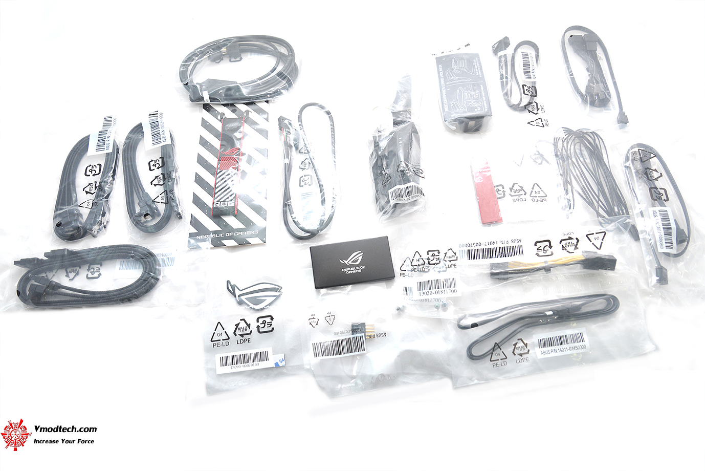 Cables 1 x 1-to-3 ARGB splitter cable 2 x 1-to-4 fan splitter cable 1 x RGB extension cable 3 x ROG weave SATA 6G cables 1 x 3-in-1 Thermistor cables pack ROG Fan Controller 1 x ROG Fan Controller 1 x Fan EXT PWR cable 1 x ARGB input cable 1 x USB input cable 1 x ROG Fan Controller 3M Mounting tape 1 x Fan Controller manual ROG DIMM.2 with Heatsink 1 x ROG DIMM.2 with heatsink 1 x M.2 pad for ROG DIMM.2 2 x M.2 screw package for ROG DIMM.2