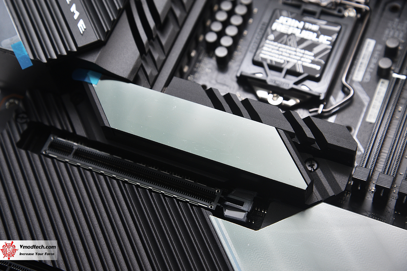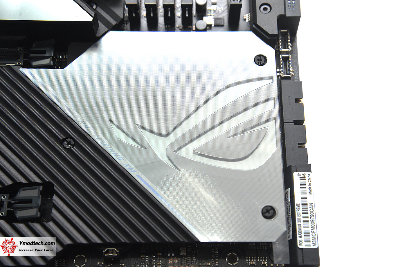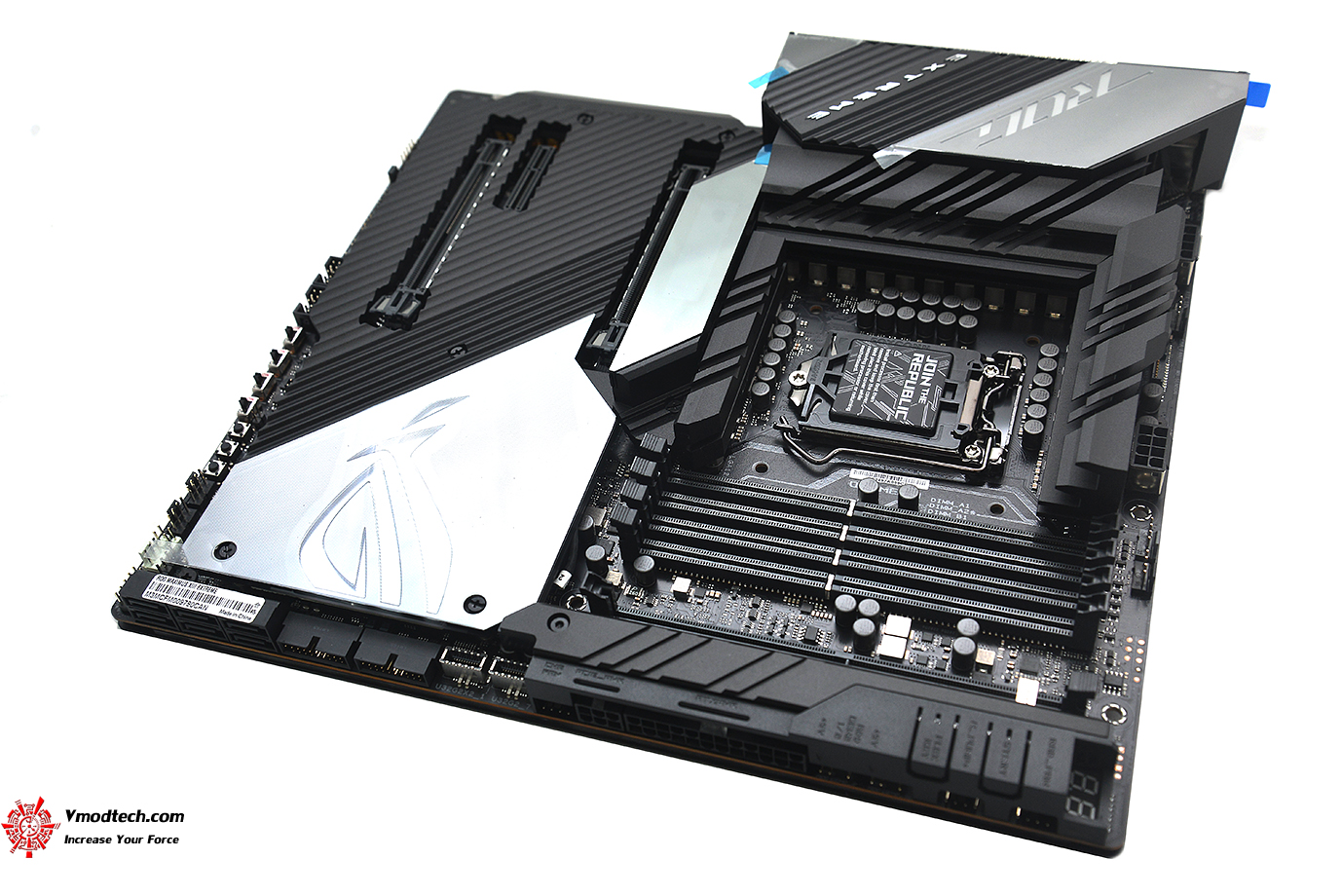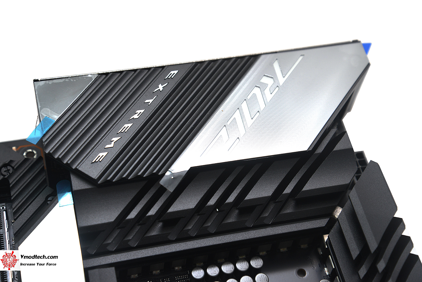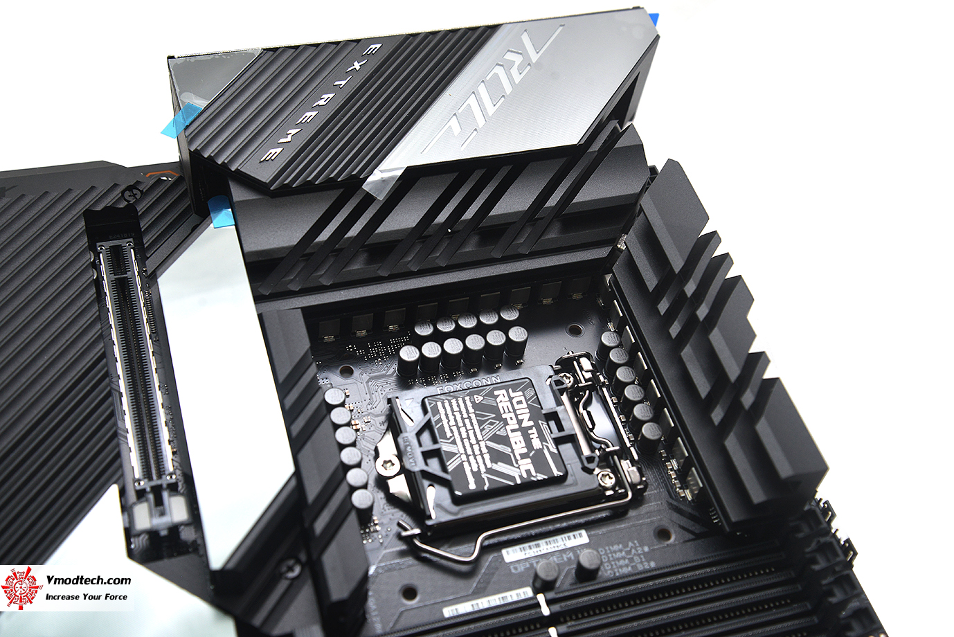 ด้านบนก็เป็นฮีตซิงค์ภาคจ่ายไฟแบบ VRM HEATSINK & ALUMINUM I/O SHROUD ที่มีภาคจ่ายไฟแบบ VRM 18+2 POWER STAGES ขนาดใหญ่พร้อมชุดไฟ RGB และโลโก้ดูสวยงามโดดเด่นอย่างมาก