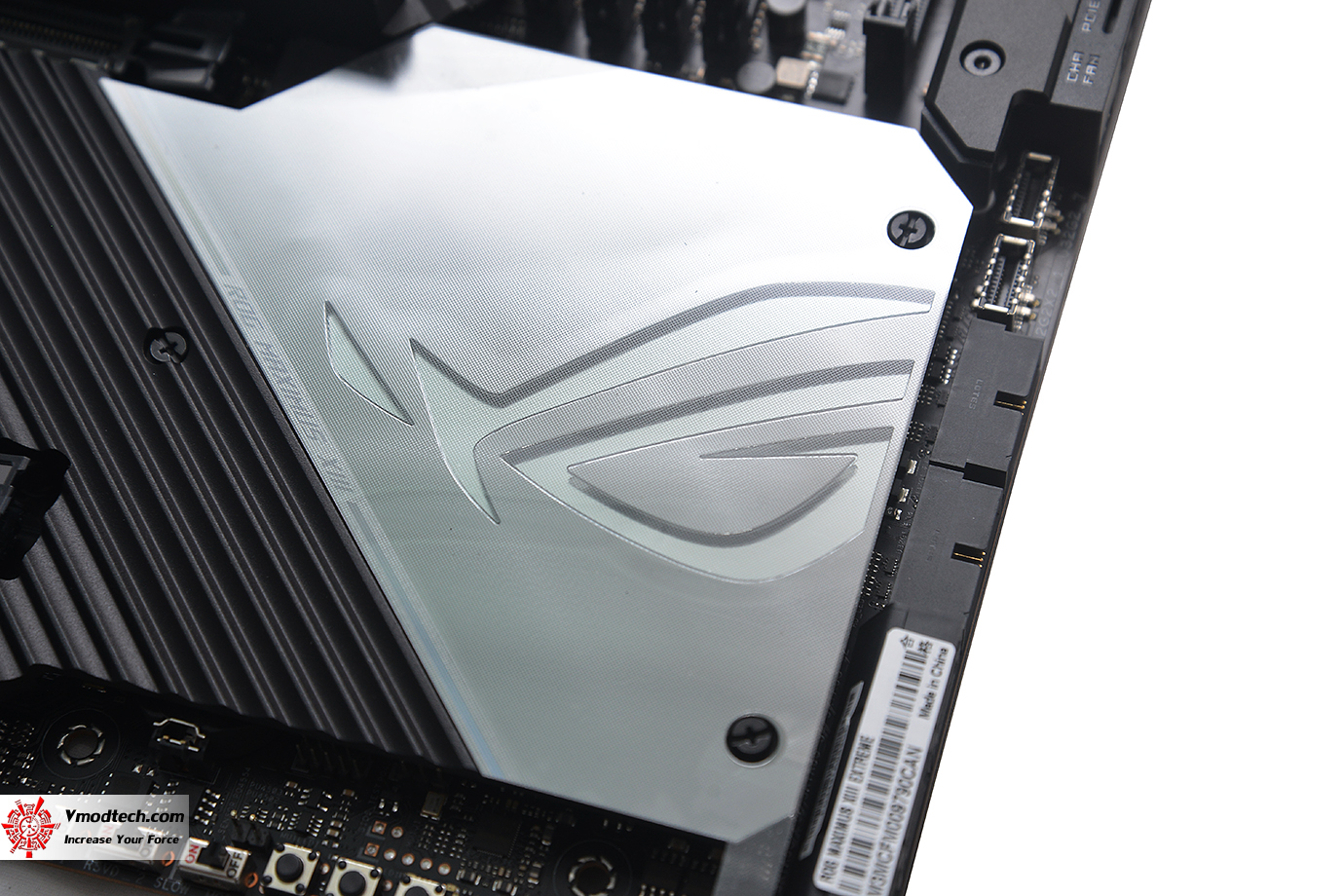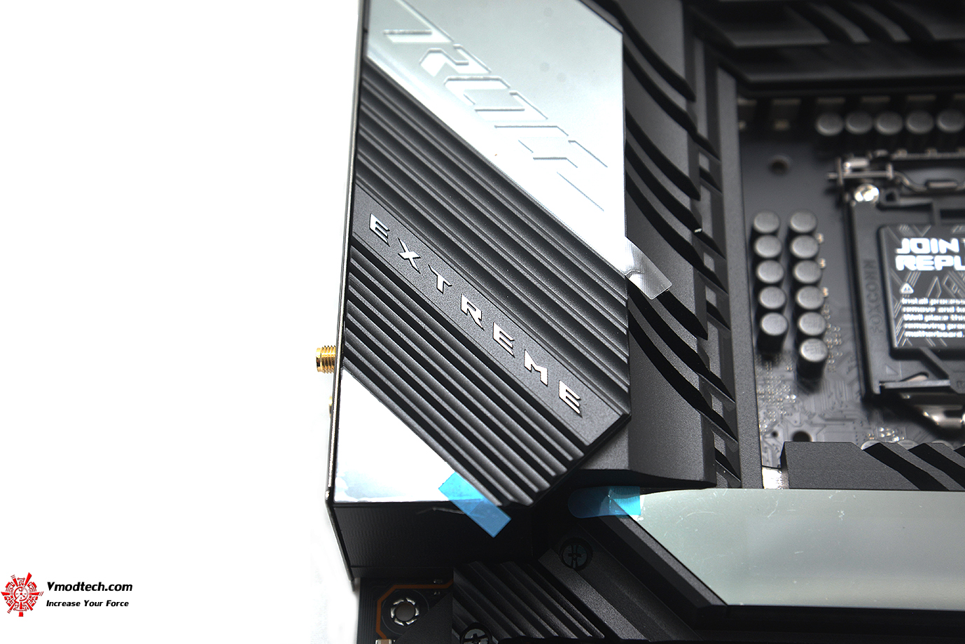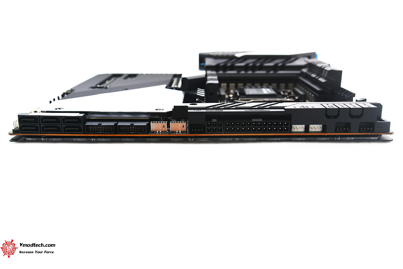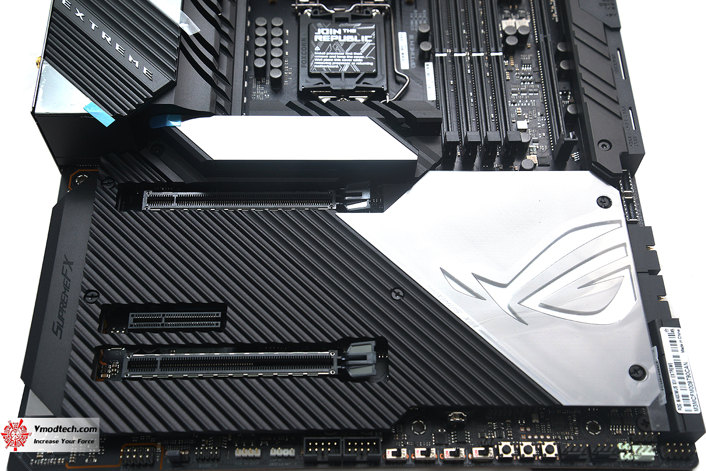 ด้านบนก็เป็นฮีตซิงค์ภาคจ่ายไฟแบบ VRM HEATSINK & ALUMINUM I/O SHROUD ที่มีภาคจ่ายไฟแบบ VRM 18+2 POWER STAGES ขนาดใหญ่พร้อมชุดไฟ RGB และโลโก้ดูสวยงามโดดเด่นอย่างมาก