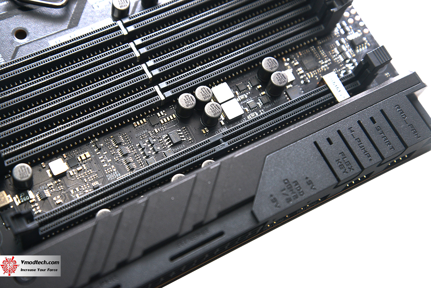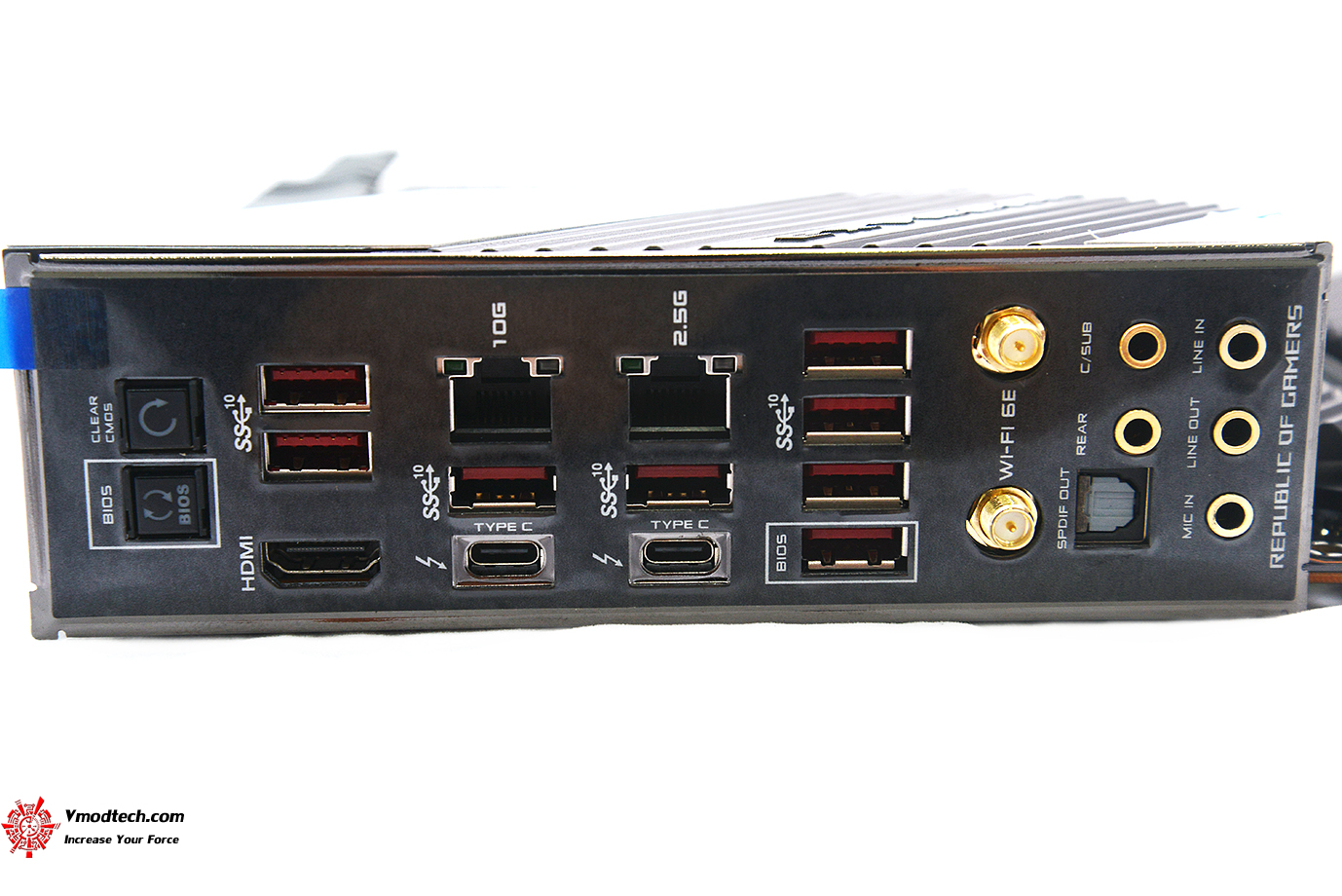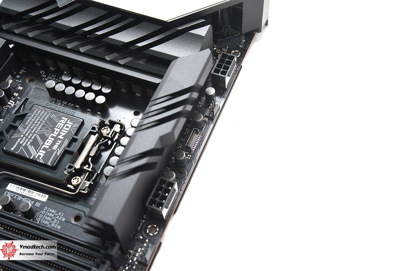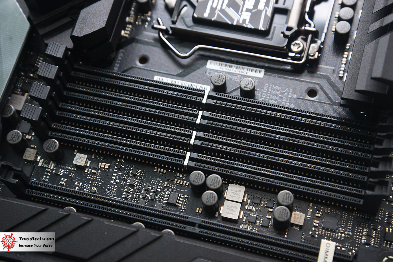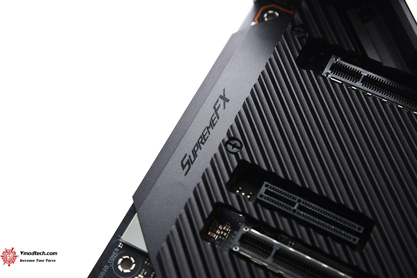 ด้านบนก็เป็นฮีตซิงค์ภาคจ่ายไฟแบบ VRM HEATSINK & ALUMINUM I/O SHROUD ที่มีภาคจ่ายไฟแบบ VRM 18+2 POWER STAGES ขนาดใหญ่พร้อมชุดไฟ RGB และโลโก้ดูสวยงามโดดเด่นอย่างมาก