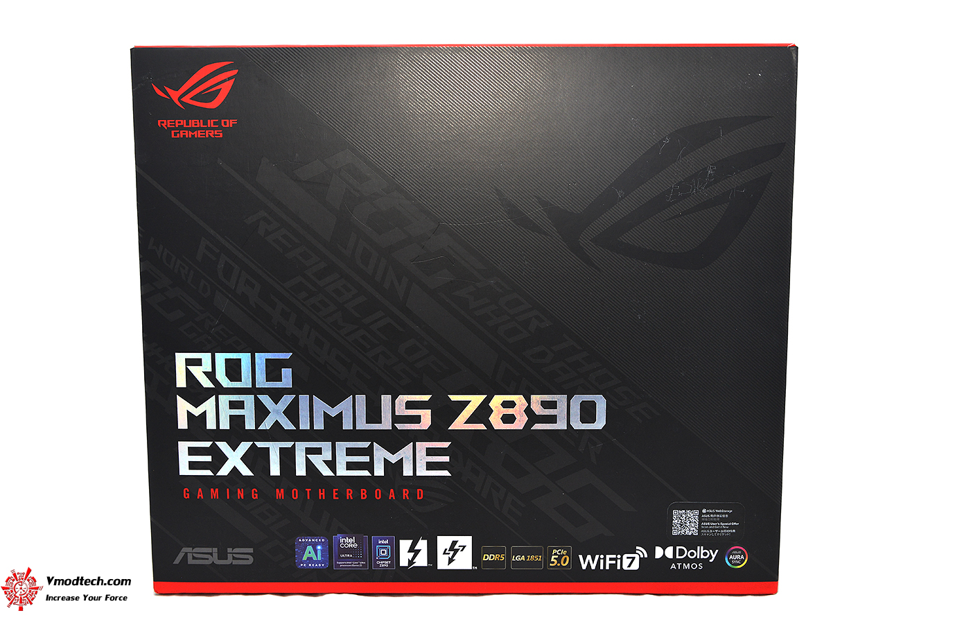 ตัวกล่องสีดำตามสไตล์ ROG สวยงามอลังการพร้อมบอกชื่อรุ่น ASUS ROG MAXIMUS Z890 EXTREME เอาไว้ชัดเจน
