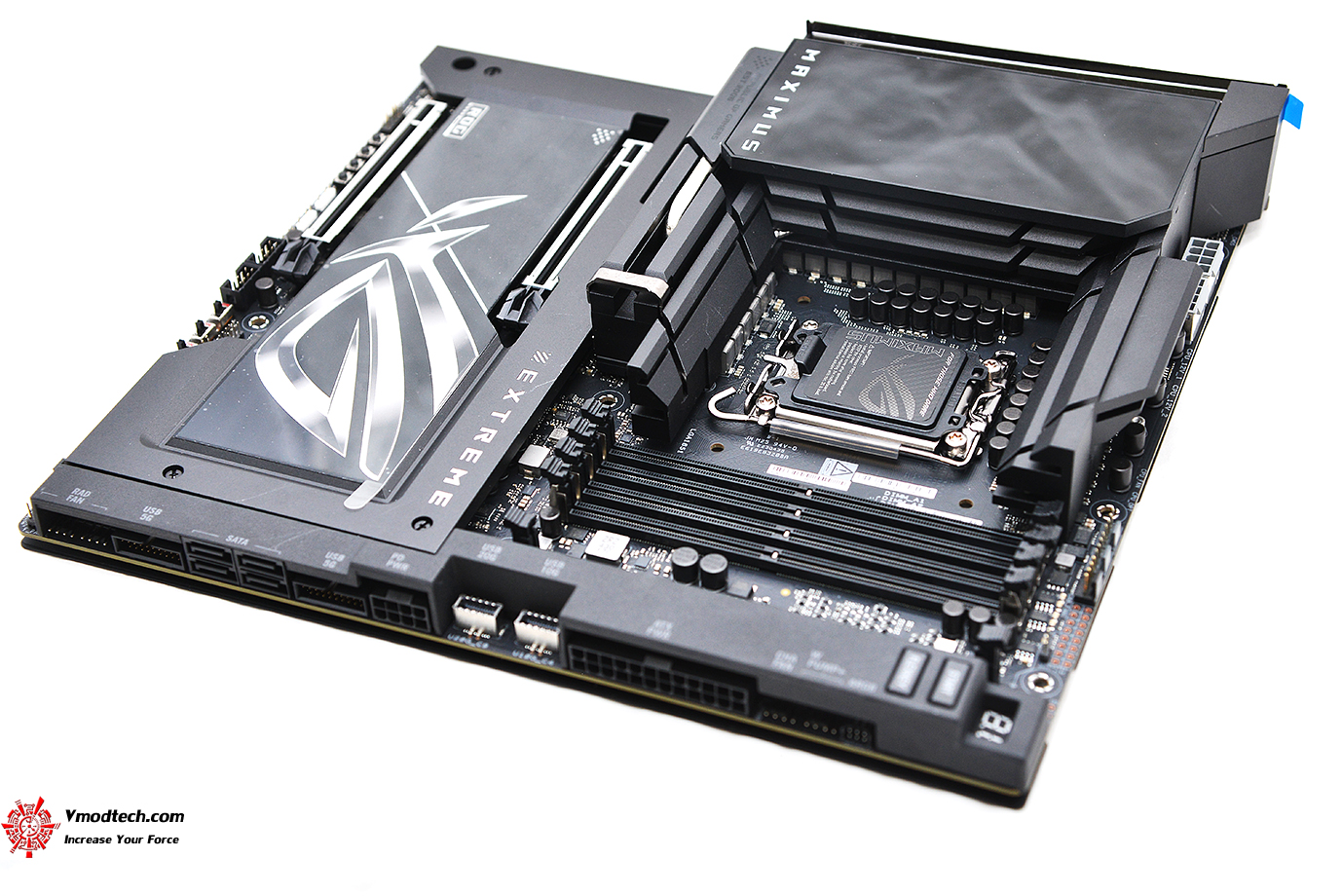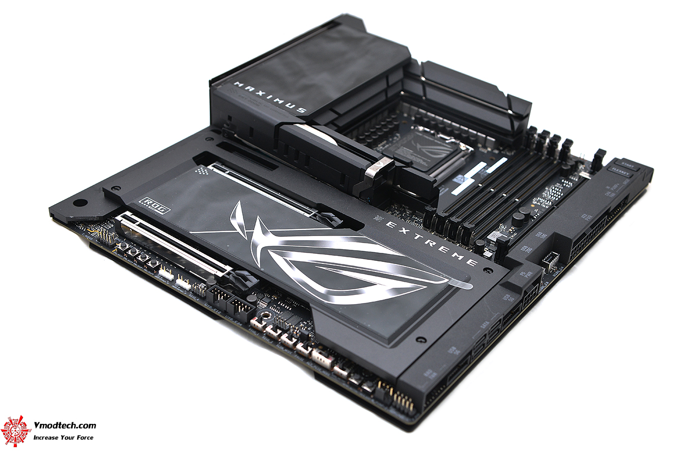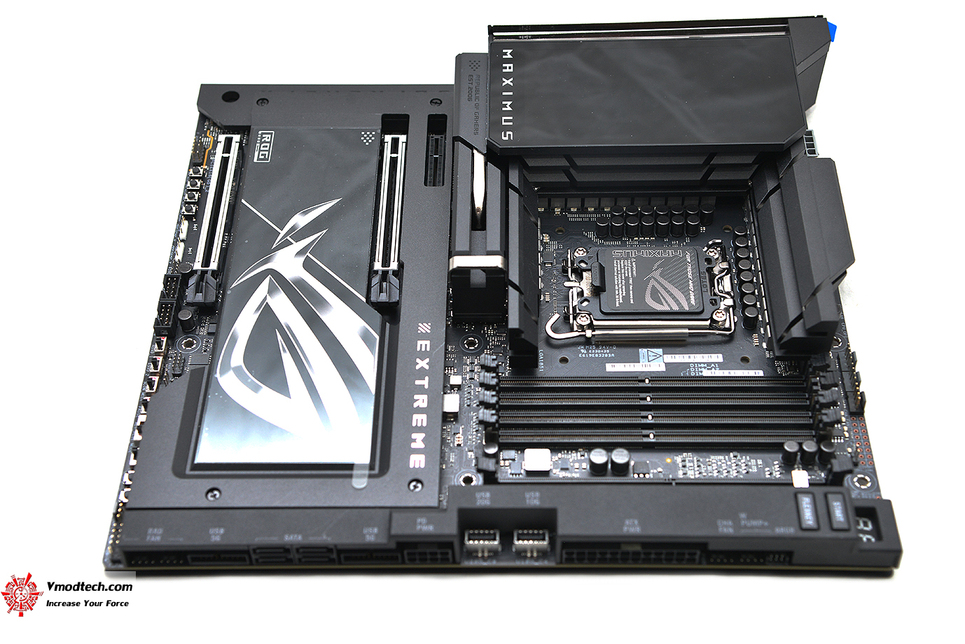 ตัวเมนบอร์ด ASUS ROG MAXIMUS Z890 EXTREME นั้นสีดำสนิทพร้อมฮีตซิงค์ขนาดใหญ่ทั่วเมนบอร์ด