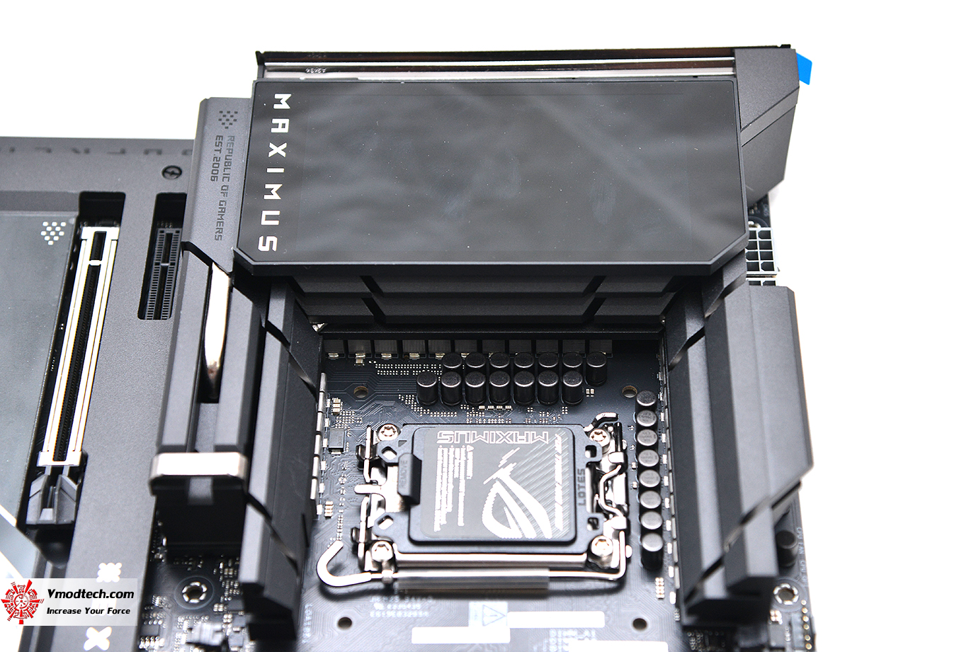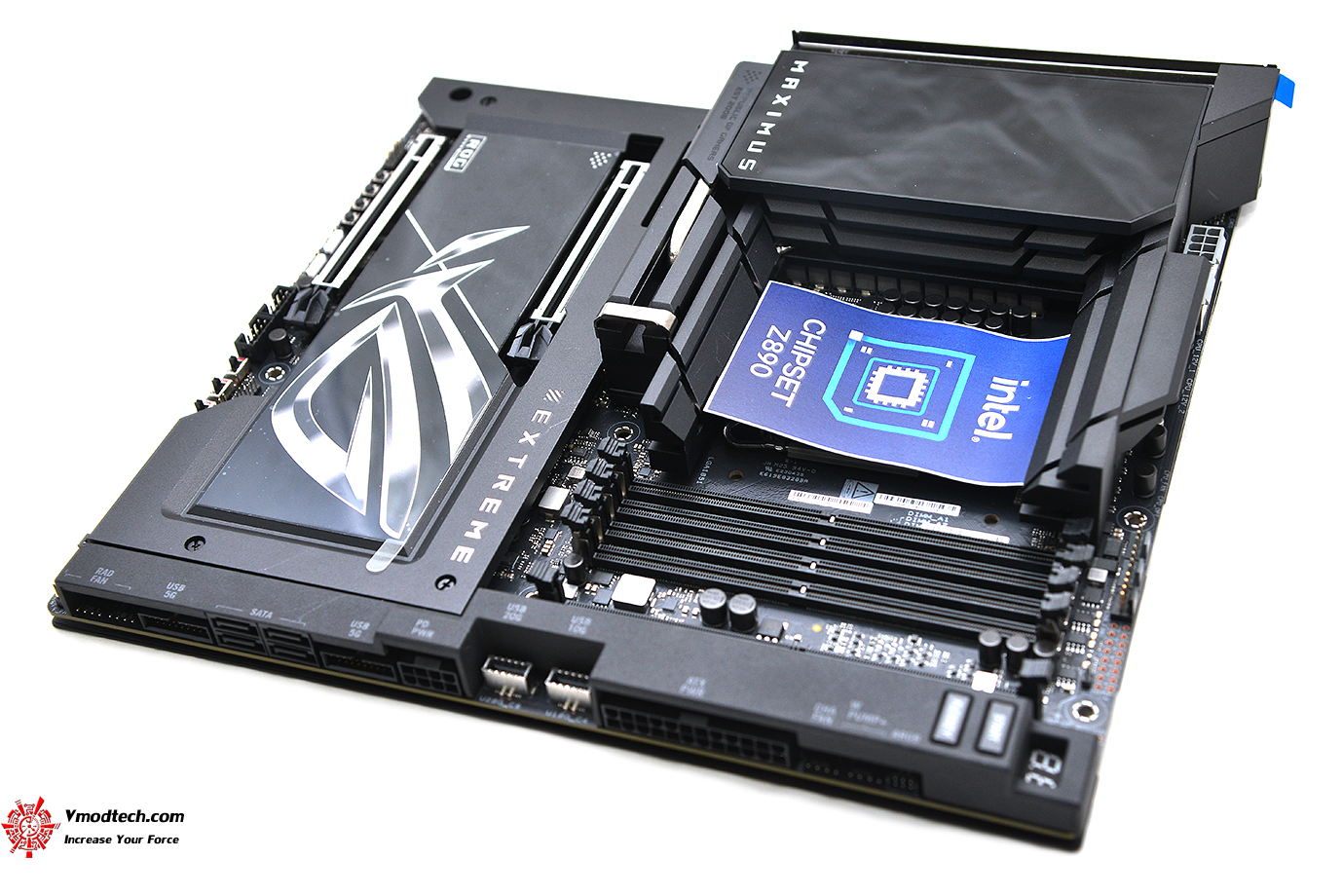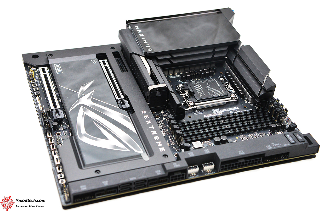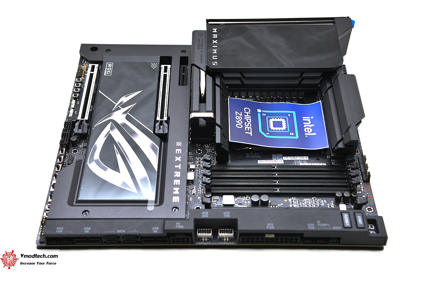ตัวเมนบอร์ด ASUS ROG MAXIMUS Z890 EXTREME นั้นสีดำสนิทพร้อมฮีตซิงค์ขนาดใหญ่ทั่วเมนบอร์ด