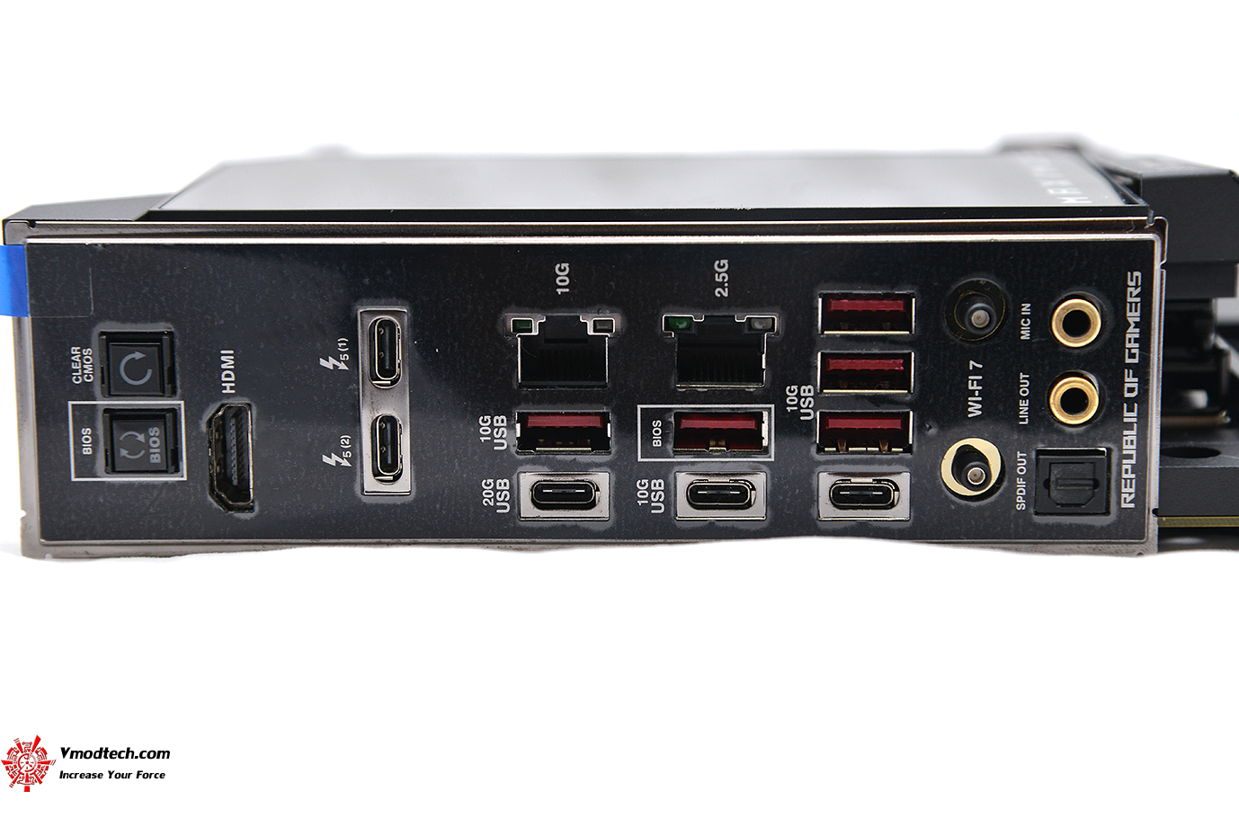 2 x Thunderbolt™ 5 USB Type-C® ports 1 x USB 20Gbps port (1 x USB Type-C®) 7 x USB 10Gbps ports (5 x Type-A + 2 x USB Type-C®) 1 x HDMITM port 1 x Wi-Fi Module 1 x Intel® 2.5Gb Ethernet port 1 x Marvell® AQtion 10Gb Ethernet port 2 x LED-illuminated audio jacks 1 x Optical S/PDIF out port 1 x BIOS FlashBack™ button 1 x Clear CMOS button