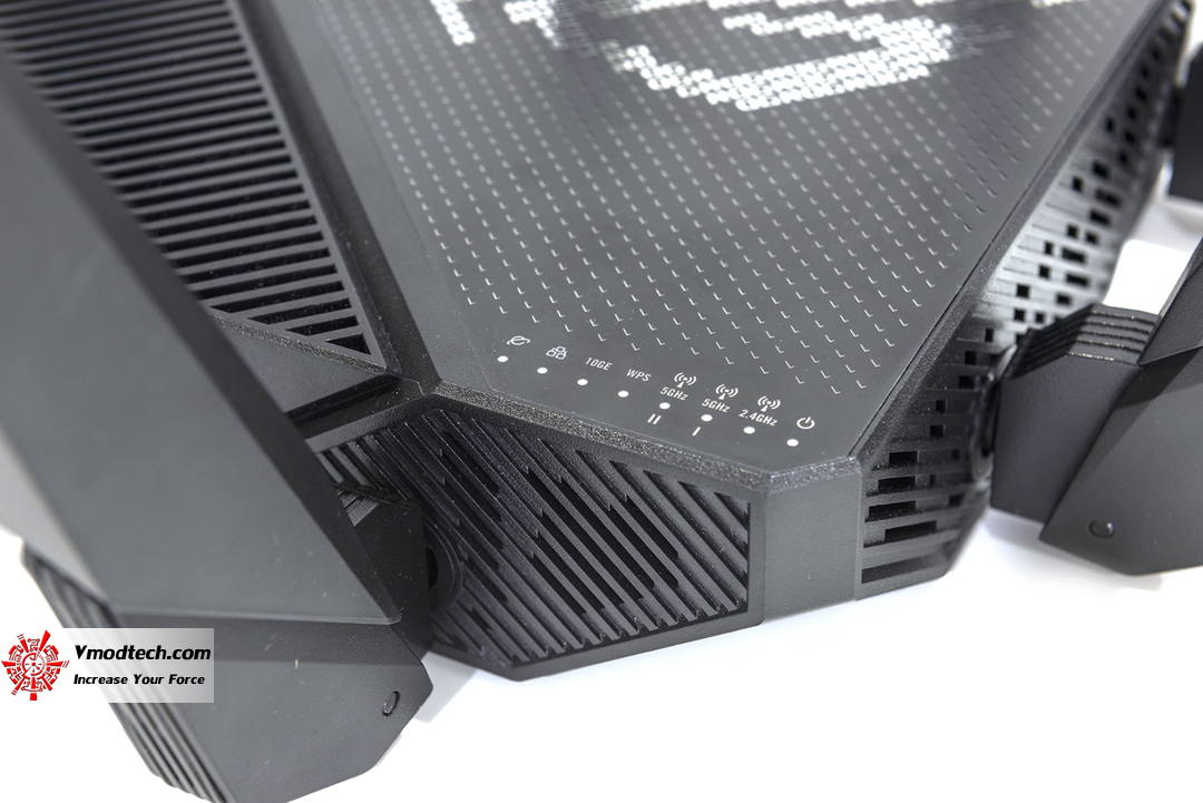 ตัว ASUS ROG RAPTURE GT-AX11000 Pro นั้นจะมีลักษณะสีเหลี่ยมจัตุรัสครับ การขึ้นรูปตัวถังนั้นก็จะมีเทกเจอร์สวยงามทีเดียว