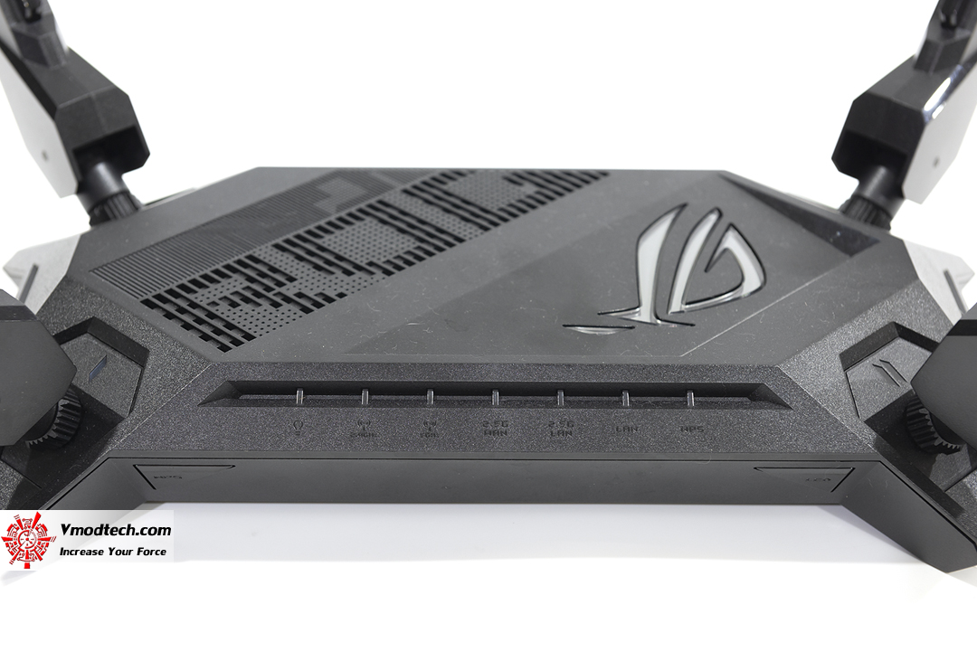 ตัว ROG Rapture GT-AX6000 นั้นจะมีลักษณะสีเหลี่ยมผืนผ้าแนวนอนครับ การขึ้นรูปตัวถังนั้นก็จะมีเทกเจอร์สวยงามทีเดียว ไฟแสดงผลด้านหน้านั้นจะสามารถบอกสถานะการเชื่อมต่ออินเตอร์เนตและแลน