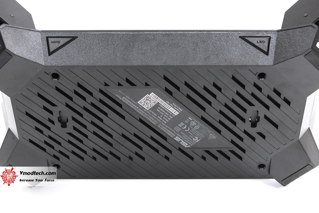 ที่ด้านใต้ของเราเตอร์จะมีช่องระบายความร้อนอยู่เต็มพื้นที่เลยครับ ไม่ใช่ว่าร้อนนะแต่เพื่อเพิ่มเสถียรภาพในการทำงานแม้ในสภาวะโหลดหนักๆ ในรูปนี้จะเห็นมุมบนมีสองปุ่มนะครับ ปุ่มนึงจะเป็นปุ่ม WPS สำหรับจับคู่อุปกรณ์ ส่วนปุ่มที่อยู่ด้านขวาจะเป็นปุ่มสำหรับเปิดและปิดไฟแสดงการทำงานบนตัวเราเตอร์ครับ